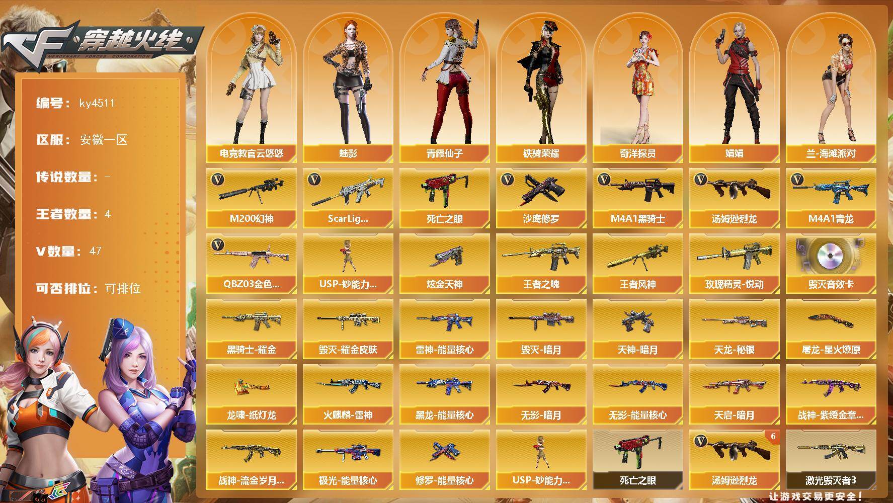 [16197886]安徽一区-47V-4王者-1炫金 【热门武器】:QBZ03-金色蔷薇*2,Scar Light-白虎,M4A1-青龙,M200-幻神,死亡之眼*2,M4A1-黑骑士,汤姆逊-烈龙*6,USP-钞能力灵狐,沙鹰-修罗*2 【王者炫金武器】:玫瑰精灵-悦动,王者之魄,王者风神,炫金天神 【音效卡】:Barrett-毁灭音效卡 【皮肤】:雷神-能量核心,火麒麟-雷神,毁灭-暗月*2,毁灭耀金皮肤,黑龙-能量核心*2,黑骑士耀金皮肤*2,无影-暗月,无影-能量核心,天启-暗月,战神-紫绶金章皮肤,战神-流金岁月皮肤,天龙-秘银,极光-能量核心,修罗-能量核心,天神-暗月,屠龙-星火燎原,龙啸-纸灯龙皮肤 【角色】:魅影,电竞教官-云悠悠,奇洋探员,娟娟,兰-海滩派对,潘多拉-X,潜龙队-X,青霞仙子,铁骑荣耀,影武者-X,游珑儿 【人偶武器】:USP-钞能力灵狐 【暴走生化】:死亡之眼*2 【挑战大师】:激光毁灭者III 【英雄级武器】:AK47-火麒麟,M4A1-黑龙,M4A1-雷神,M4A1-黑骑士,M4A1-死神,AK47-黑武士,AK47-黑鲨,M4A1-青龙,Scar Light-白虎,黑武士-锦绣游龙,M4A1-玫瑰精灵,QBZ03-金色蔷薇*2,AK-47-猩红传说*4,AWM-天龙,Barrett-毁灭,Barrett-极光,AWM-裁决,M200-幻神,Barrett-金色蔷薇,汤姆逊-烈龙*6,沙鹰-修罗*2,沙鹰-天神,屠龙*3,龙啸,擎天*2,麒麟刺*2,擎天-竞技荣光,高爆手雷-竞技荣光,高爆手雷-云龙,手雷-热带奇洋,闪光弹-竞技荣光 【道具】:CFS限定背包,奇洋探员-海龟背包,炫彩背包,超级背包*2,绿色巨人,灵魂忍者,变异宝贝,生化弹匣,夺命之镰,防化服,金色流光-枪王排位*2,星辰流光-枪王排位,枪王排位28赛季金色流光,防弹头盔,防弹衣,C4工具钳,手雷包 【特殊枪械】:1白虎,1黑骑士,6烈龙
