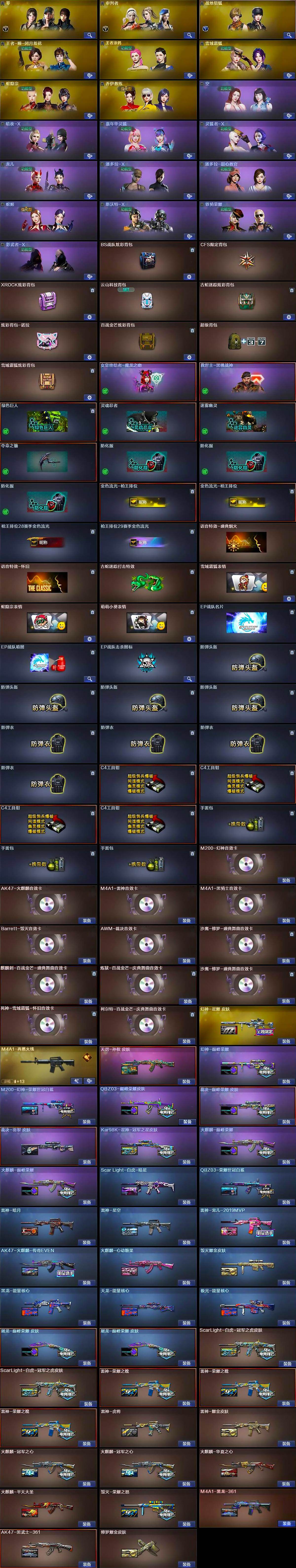 【皮肤】:幻神-巅峰荣耀,M200-幻神-荣耀世冠白鲨,幻神-星耀 皮肤,Scar Light-白虎-暗星,ScarLight-白虎-冠军之虎皮肤*2,QBZ03-荣耀世冠白鲨,QBZ03-巅峰荣耀皮肤,裁决-巅峰荣耀 皮肤,裁决-羽掣 皮肤,Kar98K-星神-冠军之星皮肤,雷神-暗月,雷神-荣耀之魄*3,雷神-星空,雷神-虎将,雷神-耀金皮肤,雷神-宠儿-2019MVP,M4A1-再燃火线,火麒麟-冠军之心*2,火麒麟-华夏之心,AK47-火麒麟-传奇EVEN,火麒麟-平天大圣,火麒麟-巅峰荣耀*2,火麒麟-心动糖果,毁灭-荣耀之怒,毁灭耀金皮肤,黑龙-能量核心,M4A1-黑龙-361,AK47-黑武士-361,天罚-孙权 皮肤,天龙-能量核心,极光-能量核心,修罗耀金皮肤,屠龙-巅峰荣耀 皮肤*2,轻型军用手斧-再燃火线