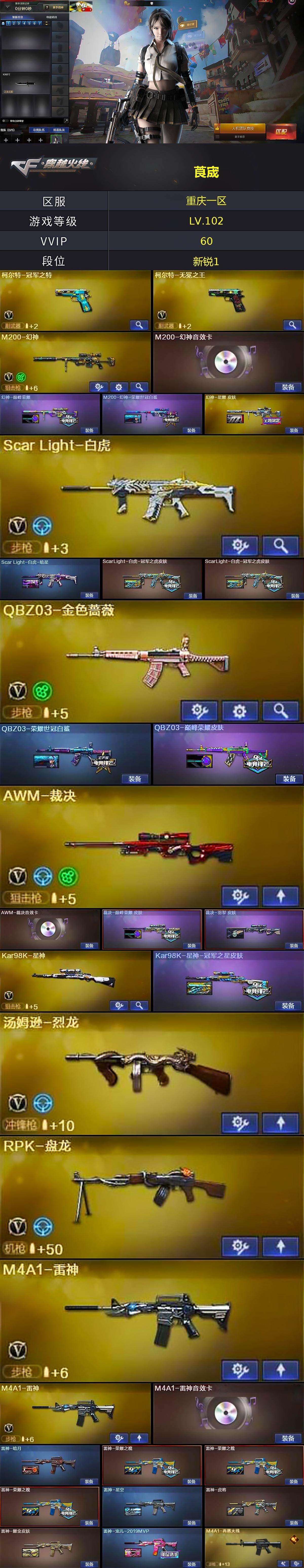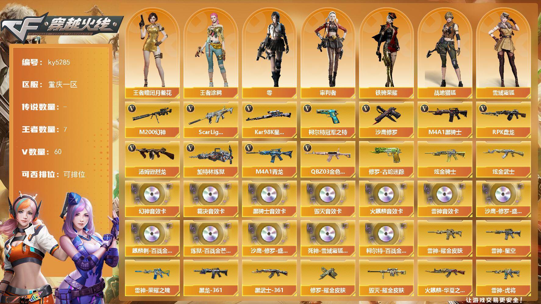 [16307297]重庆一区-63V-7王者武器数-2炫金武器数 【热门武器】:QBZ03-金色蔷薇,Scar Light-白虎,M4A1-青龙,M200-幻神,修罗-古蛇迷踪,柯尔特-冠军之特,Kar98K-星神,M4A1-黑骑士,汤姆逊-烈龙,RPK-盘龙,加特林-炼狱,沙鹰-修罗 【王者炫金武器】:炫金骑士,炫金武士 【音效卡】:M200-幻神音效卡,AK47-火麒麟音效卡,M4A1-雷神音效卡,M4A1-黑骑士音效卡,Barrett-毁灭音效卡,AWM-裁决音效卡,沙鹰-修罗-盛典舞曲音效卡*2,麒麟刺-百战金芒-盛典舞曲音效卡,炼狱-百战金芒-庆典舞曲音效卡,死神-雪域霜狐-怀旧音效卡,柯尔特-百战金芒-庆典舞曲音效卡 【皮肤】:幻神-巅峰荣耀,M200-幻神-荣耀世冠白鲨,幻神-星耀 皮肤,Scar Light-白虎-暗星,ScarLight-白虎-冠军之虎皮肤*2,QBZ03-荣耀世冠白鲨,QBZ03-巅峰荣耀皮肤,裁决-巅峰荣耀 皮肤,裁决-羽掣 皮肤,Kar98K-星神-冠军之星皮肤,雷神-暗月,雷神-荣耀之魄*3,雷神-星空,雷神-虎将,雷神-耀金皮肤,雷神-宠儿-2019MVP,M4A1-再燃火线,火麒麟-冠军之心*2,火麒麟-华夏之心,AK47-火麒麟-传奇EVEN,火麒麟-平天大圣,火麒麟-巅峰荣耀*2,火麒麟-心动糖果,毁灭-荣耀之怒,毁灭耀金皮肤,黑龙-能量核心,M4A1-黑龙-361,AK47-黑武士-361,天罚-孙权 皮肤,天龙-能量核心,极光-能量核心,修罗耀金皮肤,屠龙-巅峰荣耀 皮肤*2,轻型军用手斧-再燃火线 【角色】:零,审判者,战地猎狐,王者-瞳-闭月羞花,王者涂鸦,雪域霜狐,蛇隐宗,乔伊教练,空,暗夜-X,嘉年华灵狐,灵狐者-X,龙儿,潘多拉-X,潘多拉-甜心教官,蛇姬,斯沃特-X,铁骑荣耀,樱-缤纷夏日,影武者-X 【人偶武器】:M4A1-雷神-精英刀锋,AWM-灵狐-15周年嘉年华*2,生化手雷-机甲核心,闪光弹-小乔 【挑战大师】:冰龙粉碎者-白马银枪,激光毁灭者III-白马银枪 【英雄级武器】:AK47-火麒麟*2,M4A1-黑龙,M4A1-雷神*2,M4A1-黑骑士,AK47-无影,M4A1-死神,AK47-黑武士,AK12-天启,AN94-超新星,M4A1-青龙,Scar Light-白虎,无影-神兵利器,死神-雪域霜狐,