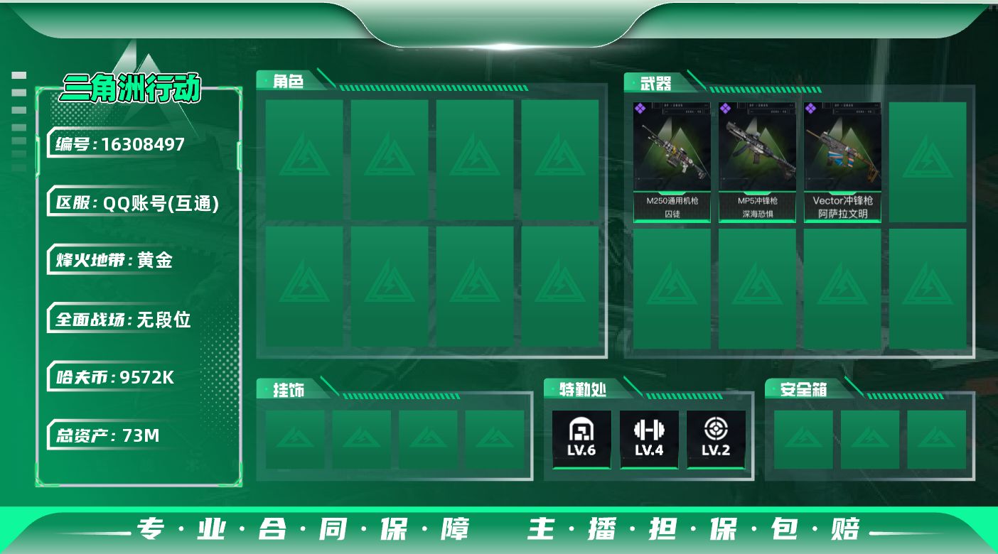 [16308497]【特价出售/店主推荐】73m总资产-9572k哈伏币-53烽火等级-黄金-1战场等级-无军衔 【近战皮肤】:近战-黑鹰 【史诗外观】:MP5冲锋枪-深海恐惧,Vector冲锋枪-阿萨拉文明,M250通用机枪-囚徒 【稀有外观】:AKM突击步枪-肃杀,SG552突击步枪-2026,SCAR-H战斗步枪-荣耀列队,K437突击步枪-生存指令,MK47突击步枪-精英联盟,MP5冲锋枪-弄臣,SMG-45-行动开启,勇士冲锋枪-冰天雪地,M1014霰弹枪-幻影结构,QJB201轻机枪-哈夫克卫队,Mini-14射手步枪-荣耀列队 【普通外观】:M4A1突击步枪-粉色涂装,M4A1突击步枪-高雅黑,M16A4突击步枪-高雅黑,MP5冲锋枪-海色,MP5冲锋枪-黄蜂,Vector冲锋枪-几何迷彩,UZI冲锋枪-海色,SV-98狙击步枪-红色涂装 【载具外观】:M1A4坦克-驯鹿,轮式突击炮-荣耀 【挂饰】:挂饰-崩岩重炮*7,挂饰-暗行哨兵*7,挂饰-关山难越,挂饰-紧急撤离*20