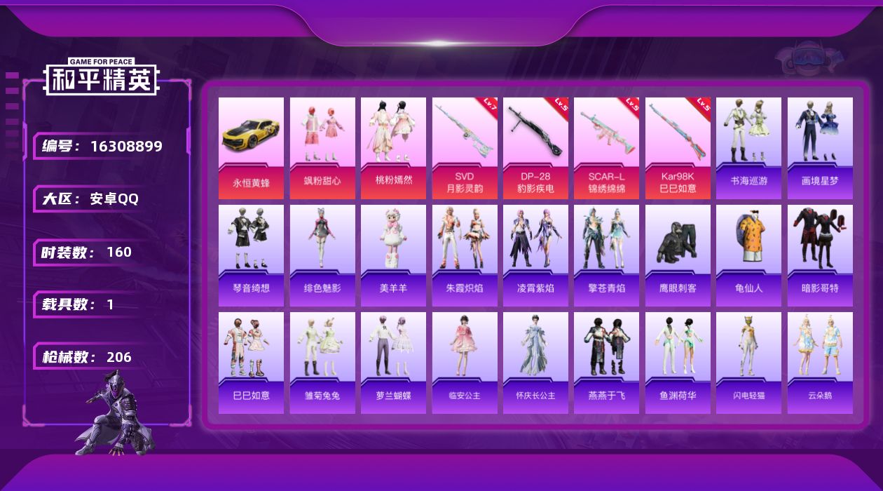 [16308899]【店主推荐捡漏号!可直接换绑】安卓 手Q-2粉装-4特效枪-1载具-1粉色飞行器-57563热力值-13王牌印记-160套装-206枪皮【热门品类】:套装-龟仙人,套装-暗影哥特【粉色套装】:粉装-飒粉甜心,粉装-桃粉嫣然【粉色枪皮等级】:SCAR-L-锦绣绵绵(五级),Kar98K-巳巳如意(五级),SVD-月影灵韵(七级),DP-28-豹影疾电(五级)【粉色载具】:永恒黄蜂【粉色枪皮】:SCAR-L-锦绣绵绵,Kar98K-巳巳如意,SVD-月影灵韵,DP-28-豹影疾电