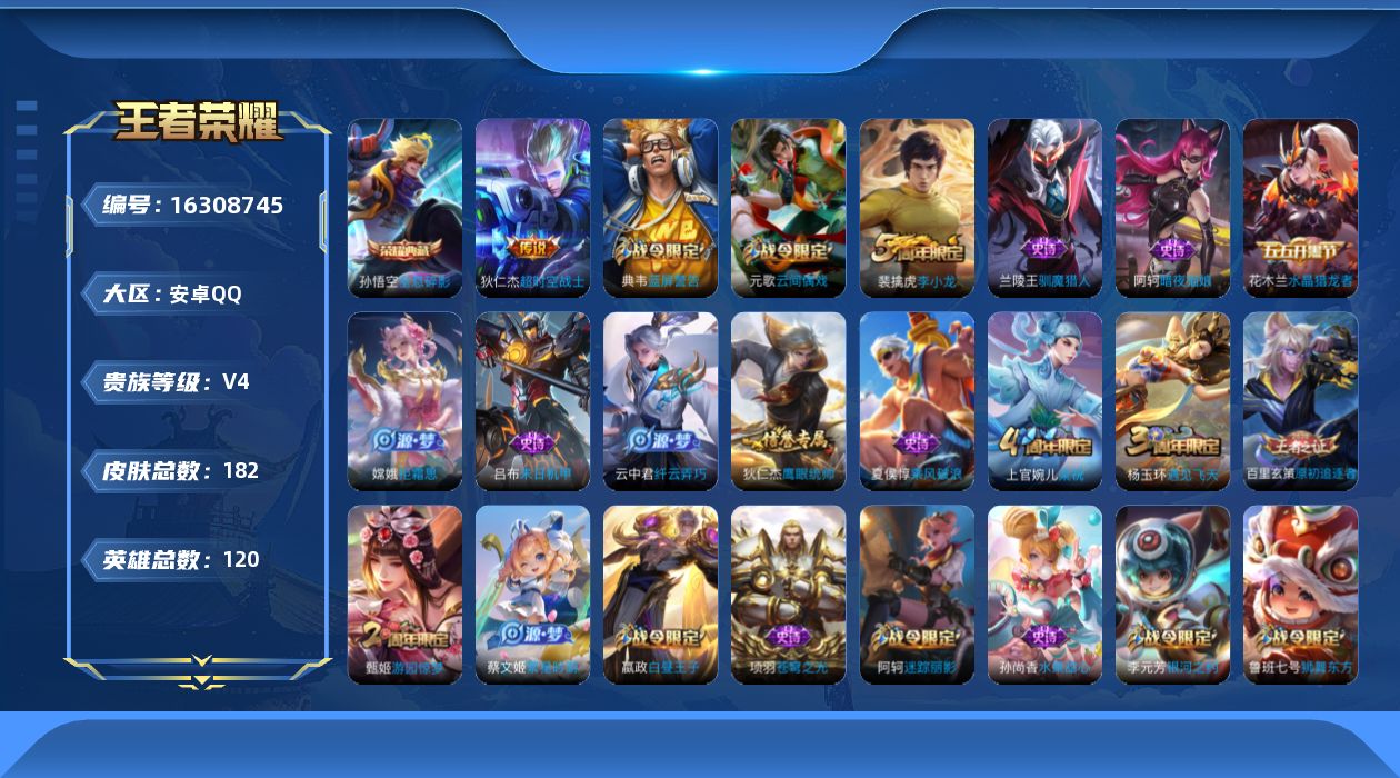[16308745]安卓Q-V4-尊贵铂金I段位-118英雄-182皮肤-1典藏皮肤-1传说-31史诗【荣耀典藏】:孙悟空全息碎影【传说皮肤】:狄仁杰超时空战士【限定皮肤】:白起狰,狄仁杰阴阳师,虞姬凯尔特女王,赵云皇家上将,嬴政白昼王子,鲁班七号狮舞东方,阿轲迷踪丽影,钟无艳王者之锤,扁鹊炼金王,芈月重明,吕布猎兽之王,周瑜赤莲之焰,元歌云间偶戏,夏侯惇朔风刀,甄姬游园惊梦,曹操烛龙,典韦穷奇,典韦蓝屏警告,狄仁杰魔术师,狄仁杰万华元夜,达摩沙漠行僧,项羽海滩派对,老夫子醍醐杖,程咬金演武夺筹,刘邦夺宝奇兵,兰陵王驯魔猎人,兰陵王金庭之子,亚瑟潮玩骑士王,牛魔御旌,李元芳银河之约,李元芳云中旅人,钟馗神迹守卫,钟馗驱傩正仪,杨玉环遇见飞天,雅典娜单词大作战,蔡文姬繁星吟游,太乙真人饕餮,太乙真人华丽摇滚,鬼谷子原初探秘者,百里玄策原初追逐者,弈星混沌棋,沈梦溪星空之诺,沈梦溪大漠名商,明世隐疑决卦,裴擒虎李小龙,狂铁御狮,米莱狄御霄,云中君纤云弄巧,盾山御銮,猪八戒西部大镖客,上官婉儿梁祝,嫦娥拒霜思,蒙犽狂想玩偶喵,桑启海盐诗旅