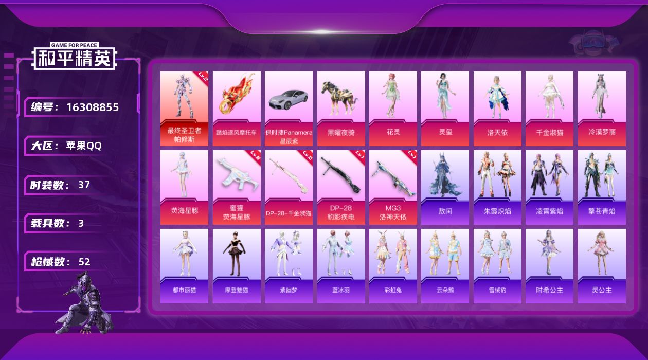 [16308855]苹果 手Q-1神装-6粉装-4特效枪-3载具-2粉色飞行器-22066热力值-1王牌印记-37套装-52枪皮 【红色神装等级】:最终圣卫者-帕修斯(二级) 【红色角色神装】:最终圣卫者-帕修斯 【粉色套装】:角色-洛天依,角色-千金淑猫,角色-冷漠罗丽,角色-荧海星豚,角色-花灵,角色-灵玺 【粉色枪皮等级】:蜜獾-荧海星豚(六级),DP-28-千金淑猫(二级),DP-28-豹影疾电(一级),MG3-洛神天依(一级) 【粉色载具】:保时捷Panamera(星辰紫),踏焰逐风摩托车,黑曜夜骑 【粉色枪皮】:蜜獾-荧海星豚,DP-28-千金淑猫,DP-28-豹影疾电,MG3-洛神天依 【粉色飞行器】:灵猫魔法师飞行器 【粉色降落伞】:洛神天依降落伞,千金淑猫降落伞,最终圣卫者降落伞,冷漠罗丽降落伞,荧海星豚降落伞,灵猫魔法师降落伞 【稀有套装】:角色-都市丽猫,角色-摩登魅猫,套装-紫幽梦,套装-蓝冰羽,套装-彩虹兔,套装-云朵鹅,套装-雪绒豹,角色-时希公主,角色-灵公主,角色-乐音,套装-蜜露汐语,套装-蓝海鲸歌,套装-朱霞炽焰,套装-凌霄紫焰,套装-擎苍青焰,角色-敖闰 【稀有枪皮】:AKM-灵猫魔法师,M16A4-千金淑猫,SCAR-L-玉兔迎春,SCAR-L-冷漠罗丽,GROZA-荧海星豚,QBZ-彩虹符号,QBZ-洛神天依,M762-云朵鹅,Mk47-洛神天依,ARX-凌霄紫焰,汤姆逊-灵猫魔法师,JS9-凌霄紫焰,Kar98K-洛神天依,SVD-云朵鹅,SVD-冷漠罗丽,S686-千金淑猫,S1897-荧海星豚,DBS-荧海星豚,SPAS-12-云朵鹅,MG-36-凌霄紫焰,P92-凌霄紫焰,蝎式手枪-千金淑猫,沙漠之鹰-云朵鹅,大砍刀-云朵鹅,撬棍-灵猫魔法师,撬棍-冷漠罗丽,平底锅-凌霄紫焰 【其他套装】:套装-王牌教练,套装-缤纷果语,套装-魅力单车,套装-电音精灵,套装-天籁歌者 【营地ID】:1004675601