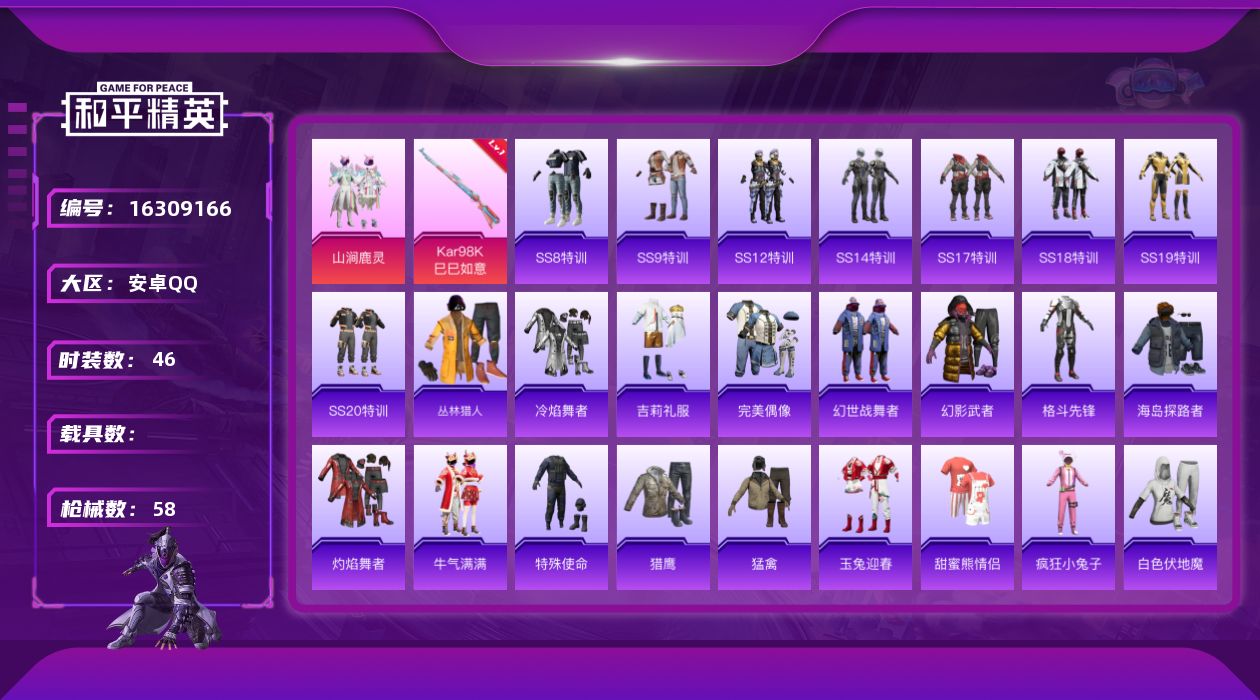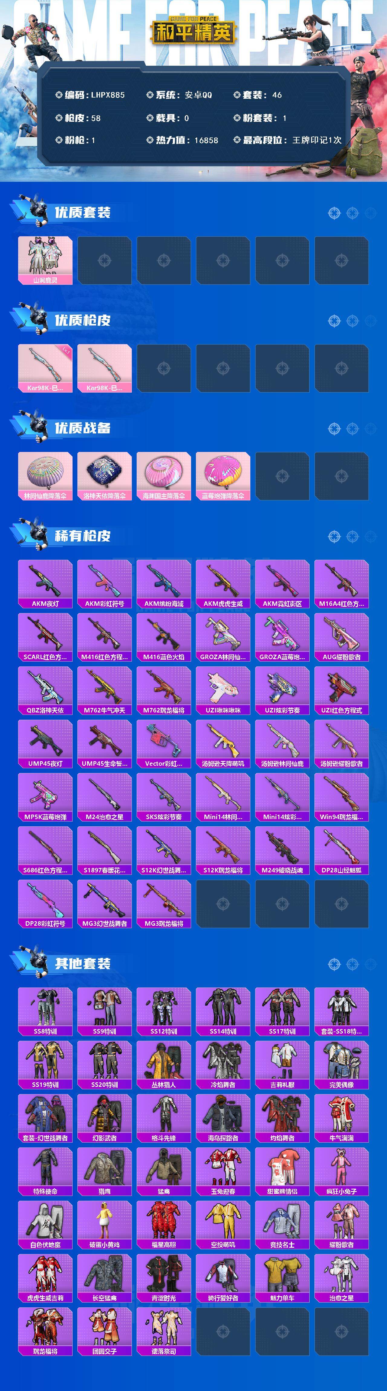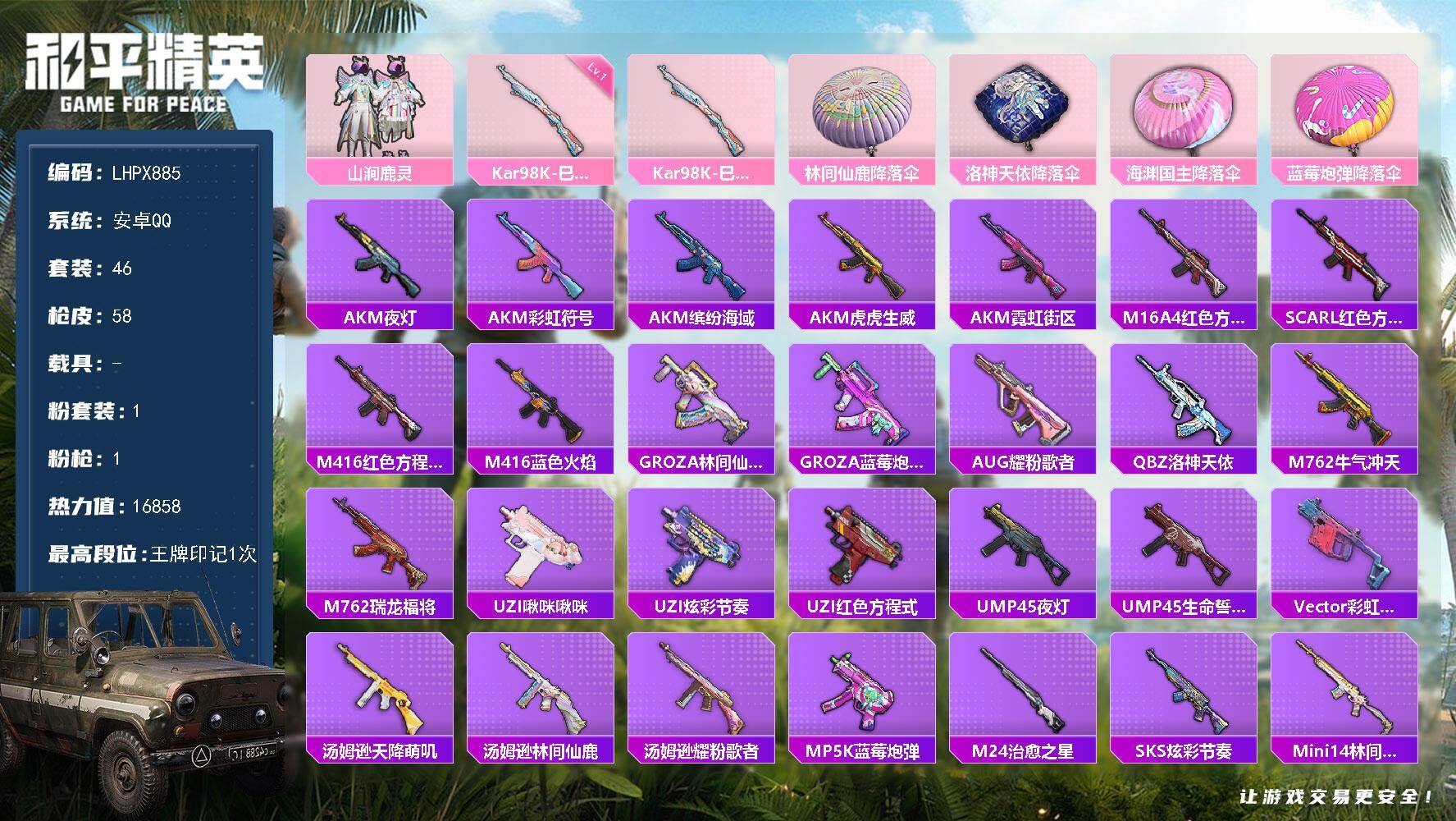 [16309166]【特价出售/店主推荐】安卓 手Q-1粉装-1特效枪-0载具-0粉色飞行器-16858热力值-1王牌印记-46套装-58枪皮【粉色套装】:粉装-山涧鹿灵【粉色枪皮等级】:Kar98K-巳巳如意(一级)【粉色枪皮】:Kar98K-巳巳如意