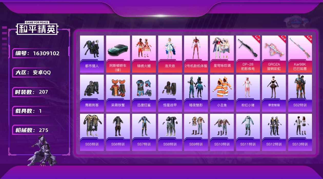 [16309102]【特价出售/店主推荐】 安卓手Q-无敌战神框-4粉装-3特效枪-1载具-2粉色飞行器-81180热力值-14王牌印记-207套装-275枪皮【热门品类】:套装-都市猎人,套装-小丑鱼,套装-粉红小猪【粉色套装】:粉装-锦绣火鲤,角色-洛天依,角色-2号机款机体服,粉装-星穹咏叹调【粉色枪皮等级】:GROZA-旋转彩虹(五级),Kar98K-巳巳如意(五级),DP-28-豹影疾电(五级)【粉色载具】:阿斯顿马丁DBS(绿)【粉色枪皮】:GROZA-旋转彩虹,Kar98K-巳巳如意,DP-28-豹影疾电【粉色飞行器】:阿狸红飞行器