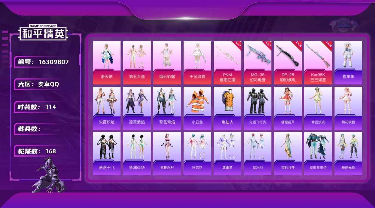 [16309807]【店主推荐捡漏号!可直接换绑】安卓 手Q-4粉装-4特效枪-0载具-1粉色飞行器-49422热力值-12王牌印记-114套装-168枪皮【热门品类】:套装-小丑鱼,套装-龟仙人【粉色套装】:角色-洛天依,粉装-第五大道,角色-烟云彩露,角色-千金淑猫【粉色枪皮等级】:Kar98K-巳巳如意(五级),DP-28-豹影疾电(五级),PKM-江南烟雨(七级),MG-36-幻彩电音(七级)【粉色枪皮】:Kar98K-巳巳如意,DP-28-豹影疾电,PKM-江南烟雨,MG-36-幻彩电音