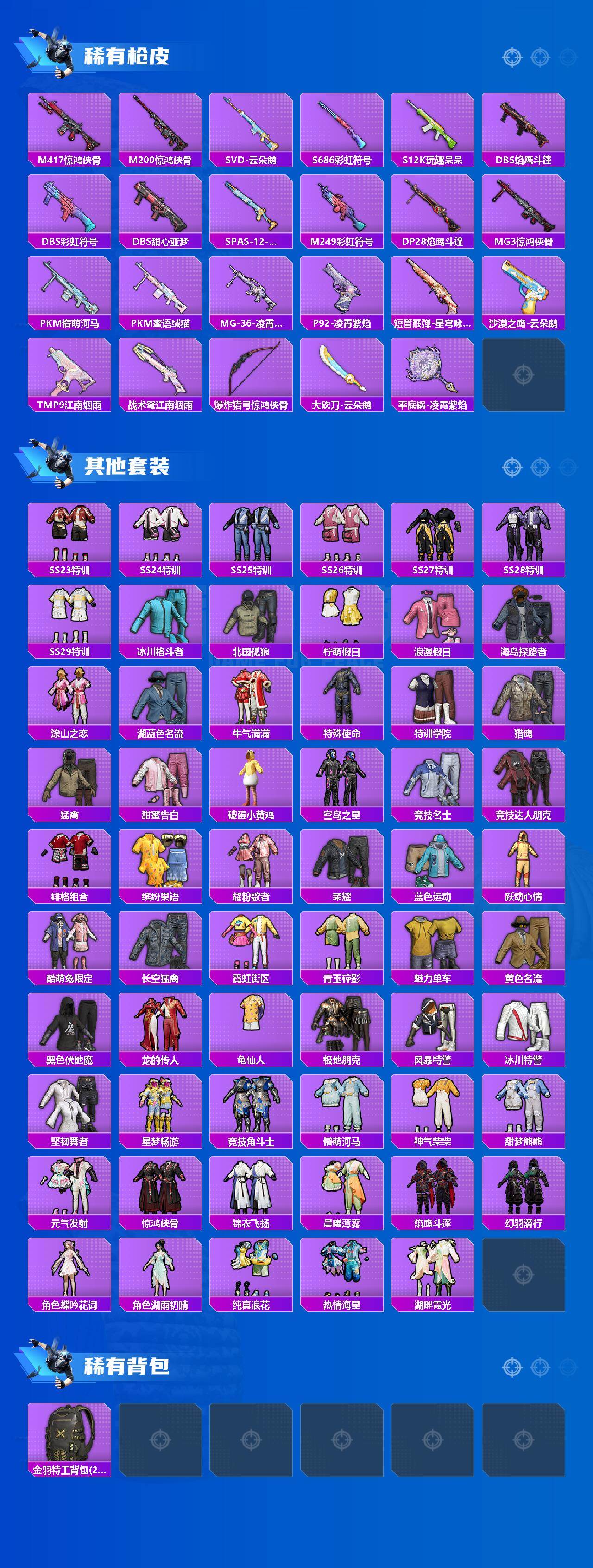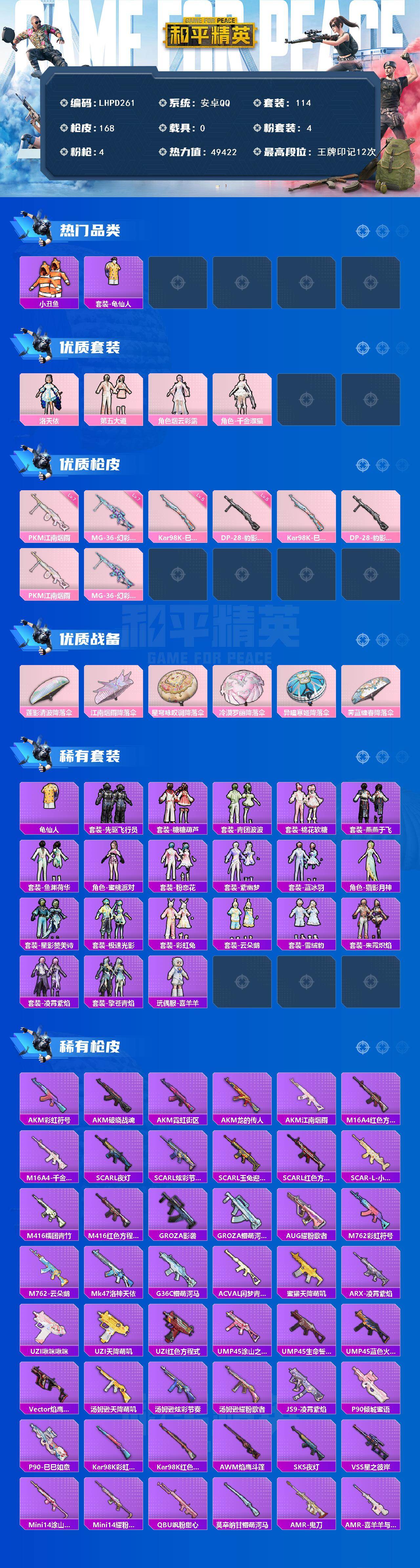 - [15158119]安卓 手Q-2粉装-4特效枪-0载具-2粉色飞行器-34312热力值-9王牌印记-88套装-128枪皮 【热门品类】:套装-龟仙人 【粉色套装】:角色-智耀战神,角色-异瞳寒姬 【粉色枪皮等级】:SCAR-L-锦绣绵绵(五级),M416-电玩时刻(五级),Kar98K-巳巳如意(五级),DP-28-豹影疾电(五级) 【粉色枪皮】:SCAR-L-锦绣绵绵,M416-电玩时刻,Kar98K-巳巳如意,DP-28-豹影疾电 【粉色飞行器】:百变魔方飞行器 【粉色降落伞】:碧影闪光降落伞,音爆索尼克降落伞,第五大道降落伞,江南烟雨降落伞,英伦信使降落伞,时光之吻降落伞,荧海星豚降落伞,极意拳锋降落伞 【稀有套装】:套装-龟仙人,套装-巳巳如意,套装-雏菊兔兔,套装-萝兰蝴蝶,角色-拉斐尔,套装-糖糖葫芦,套装-青团波波,角色-都市丽猫,套装-星影赞美诗,套装-极速光影,角色-绛羽幽主,角色-绯色魅影,套装-炫彩糖果 【稀有枪皮】:AKM-夜灯,AKM-破晓战魂,AKM-霓虹街区,AKM-极光猎影,M16A4-幻世战舞者,M16A4-莲影清波,SCAR-L-夜灯,SCAR-L-玉兔迎春,SCAR-L-红色方程式,M416-糯团青竹,M416-红色方程式,M416-蓝色火焰,GROZA-恐龙拽拽,AUG-耀粉歌者,QBZ-银河战甲,M762-天降萌叽,Mk47-炫光之旅,蜜獾-绯穹魔姬,UZI-啾咪啾咪,UZI-天降萌叽,UZI-幻影飞狐,UMP45-夜灯,UMP45-生命誓言,UMP45-极意拳锋,Vector-焰鹰斗篷,Vector-彩虹符号,P90-巳巳如意,Kar98K-六号树人,Kar98K-彩虹符号,AWM-焰鹰斗篷,AMR-鬼刀,MK20-H-樱桃泡泡,M200-六号稻草人,S686-彩虹符号,S686-生命誓言,S686-巳巳如意,S1897-荧海星豚,S12K-玩趣呆呆,S12K-夜灯,S12K-蓝晶绮麟,S12K-智耀战神,DBS-焰鹰斗篷,DBS-圣堂之誓,DBS-彩虹符号,M249-百万伏特,M249-破晓战魂,M249-莲影清波,DP-28-焰鹰斗篷,短管霰弹-星穹咏叹调,平底锅-咒蚀之裁,破片手榴弹-巳巳如意 【其他套装】:套装-SS14特训,套装-SS21特训,套装-SS22特训,套装-SS26特训,套装-SS27特训,套装-SS28特训,套装-