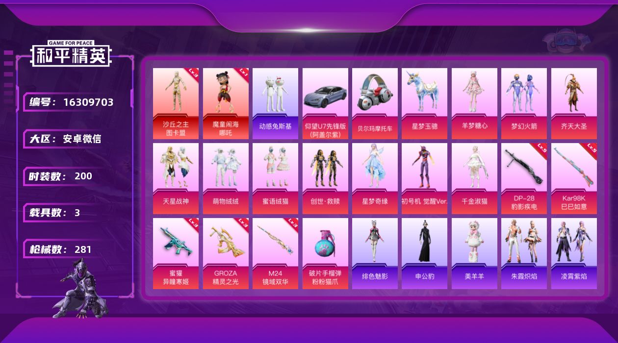 [16309703]【特价出售/店主推荐】安卓 微信-2神装-10粉装-6特效枪-3载具-13粉色飞行器-90965热力值-15王牌印记-200套装-281枪皮【红色神装等级】:魔童闹海-哪吒(一级),沙丘之主-图卡盟(三级)【红色角色神装】:魔童闹海-哪吒,沙丘之主-图卡盟【热门品类】:粉装-梦幻火箭,套装-动感兔斯基人偶服,套装-龟仙人,角色-8号机,角色-Mark.06【粉色套装】:粉装-梦幻火箭,粉装-齐天大圣,粉装-天星战神,粉装-萌物绒绒,粉装-蜜语绒猫,套装-创世·救赎,角色-星梦奇缘,角色-初号机 觉醒Ver.,角色-千金淑猫,角色-羊梦糖心【粉色枪皮等级】:GROZA-精灵之光(三级),蜜獾-异瞳寒姬(三级),Kar98K-巳巳如意(五级),M24-镜域双华(三级),DP-28-豹影疾电(五级)【粉色载具】:仰望U7(阿盖尔紫),布尔玛摩托车,星梦玉骢【粉色枪皮】:GROZA-精灵之光,蜜獾-异瞳寒姬,Kar98K-巳巳如意,M24-镜域双华,DP-28-豹影疾电,破片手榴弹-粉粉猫爪【粉色飞行器】:酣梦熊熊飞行器,齐天大圣飞行器,萌物绒绒飞行器,沙丘之主天马,镜域双华-灵镜之阶,星空武士飞行器,深渊漩涡飞行器,曦光华影飞行器,动力核心飞行器,凤舞九天飞行器,飞天猪飞行器