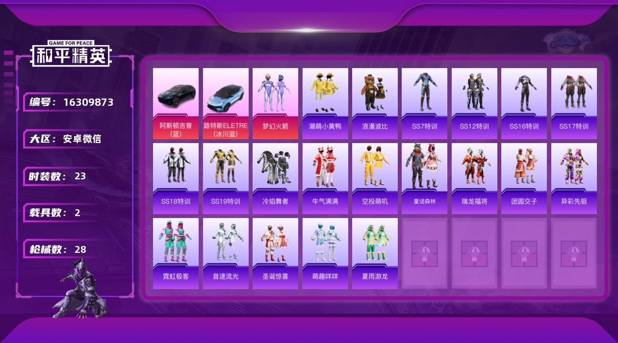 [16309873]【特价出售/店主推荐】安卓 微信-1粉装-0特效枪-2载具-0粉色飞行器-11178热力值-2王牌印记-23套装-28枪皮【热门品类】:粉装-梦幻火箭,套装-潮萌小黄鸭,套装-浪漫波比【粉色套装】:粉装-梦幻火箭【粉色载具】:阿斯顿马丁DBX(蓝),路特斯ELETRE(冰川蓝)