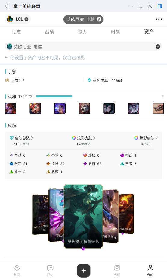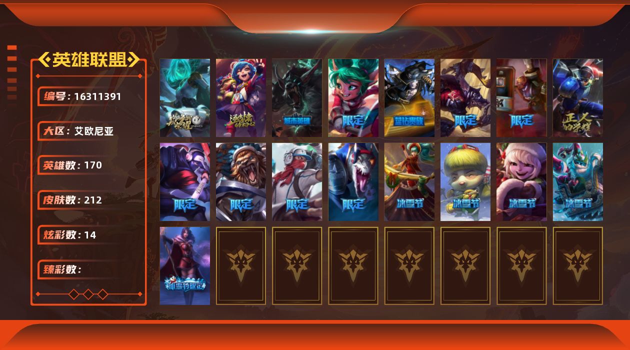 [16311391]未定级段位-170英雄-212皮肤-14炫彩-0终极-3神话-21限定-20传说-65史诗