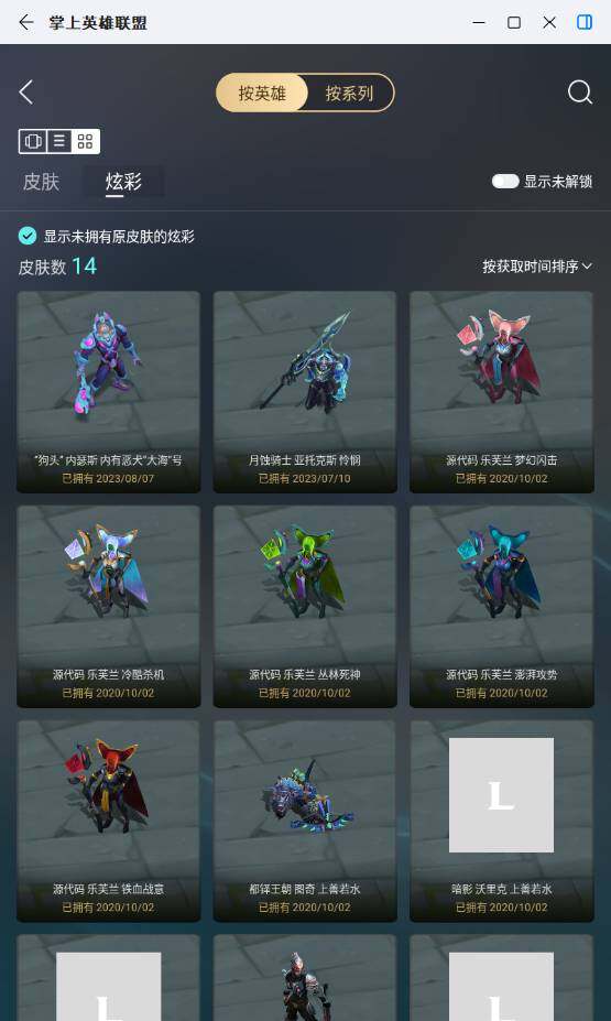 【史诗皮肤】:屠龙勇士赵信,铁钩船长费德提克,圣光审判凯尔,铁血剑豪易,战场公主希维尔,月光女神阿忒弥斯索拉卡,圣洁化身索拉卡,源代码索拉卡,狼外婆沃里克,女船长厄运小姐,国王泰达米尔,百夫长贾克斯,炼金狂士辛吉德,死神卡尔萨斯,侏罗纪化石科加斯,熔火之心拉莫斯,贵族血统萨科,飞越疯人院萨科,战争血统蒙多,夜刃艾瑞莉娅,特种部队普朗克,绝代智将斯维因,铁血狙击手凯特琳,无畏号墨菲特,源计划雄心卡特琳娜,蓝焰梦魔魔腾,灵骨工匠奥莉安娜,V字仇杀者布兰德,至高之拳李青,苍穹之光薇恩,深海妖姬卡西奥佩娅,四神之力乌迪尔,银色之牙阿卡丽,刺客信条凯南,腥红之月凯南,源计划山蕾欧娜,兔女郎锐雯,帝王斑蝶克格莫,深海怪鱼克格莫,侏罗纪化石克格莫,腥红之月鬼武者慎,ODST地狱伞兵拉克丝,星际迷航拉克丝,银河魔装机神希瓦娜,银河魔装机神菲兹,奥术大师吉格斯,永恒之森赫卡里姆,死亡绽放卡兹克,铁血帝皇德莱厄斯,生化骑士德莱厄斯,刀锋女王丽桑卓,暗黑女武神黛安娜,仲裁圣女辛德拉,亚特兰蒂斯辛德拉,灰烬领主奥瑞利安索尔,邪恶魔人扎克,源计划风亚索,腥红之月亚索,屠龙勇士布隆,猛虎布隆,黯焰双魂千珏,霓虹杀拳蔚,腥红之月锤石,虚空使者俄洛伊,糖果之王艾翁