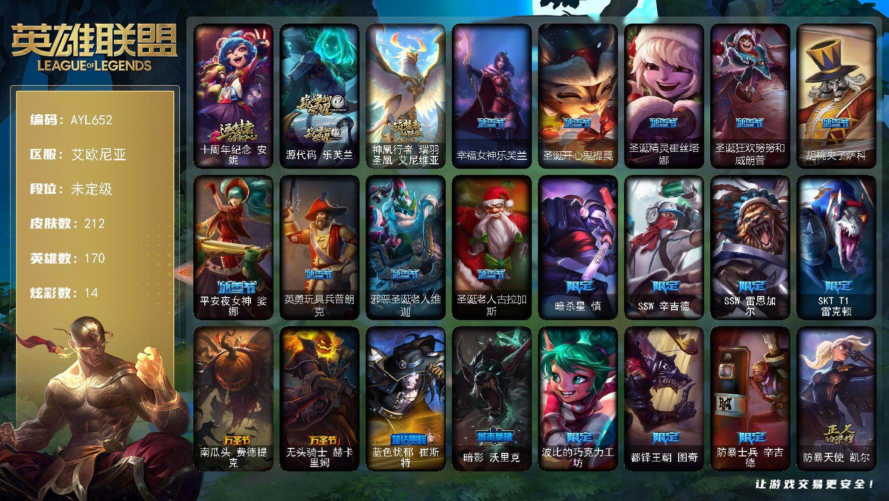 [16311391]未定级段位-170英雄-212皮肤-14炫彩-0终极-3神话-21限定-20传说-65史诗 【神话皮肤】:十周年纪念安妮,源代码乐芙兰,神凰行者瑞羽圣凰艾尼维亚 【冰雪限定】:幸福女神乐芙兰,圣诞开心鬼提莫,圣诞精灵崔丝塔娜,圣诞狂欢努努和威朗普,胡桃夹子萨科,平安夜女神娑娜,英勇玩具兵普朗克,邪恶圣诞老人维迦,圣诞老人古拉加斯 【限定皮肤】:暗杀星慎,SSW辛吉德,SSW雷恩加尔,SKTT1雷克顿,南瓜头费德提克,无头骑士赫卡里姆,蓝色忧郁崔斯特,暗影沃里克,波比的巧克力工坊,都铎王朝图奇,防暴士兵辛吉德,防暴天使凯尔 【传说皮肤】:地狱之门卫士加里奥,大天使长米迦勒凯尔,钢铁之翼凯尔,恶魔男爵瑞兹,霸天零式赛恩,烈焰雄心崔丝塔娜,驯龙炮手崔丝塔娜,绅士科加斯,战地巨兽科加斯,黯晶凤凰艾尼维亚,最终BOSS维迦,地狱行者孙悟空,死亡骑士盖伦,星之守护者拉克丝,星之守护者阿狸,宇航员诺提勒斯,泳池派对吉格斯,霸天异形卡兹克,灌篮高手德莱厄斯,黑夜使者亚索 【史诗皮肤】:屠龙勇士赵信,铁钩船长费德提克,圣光审判凯尔,铁血剑豪易,战场公主希维尔,月光女神阿忒弥斯索拉卡,圣洁化身索拉卡,源代码索拉卡,狼外婆沃里克,女船长厄运小姐,国王泰达米尔,百夫长贾克斯,炼金狂士辛吉德,死神卡尔萨斯,侏罗纪化石科加斯,熔火之心拉莫斯,贵族血统萨科,飞越疯人院萨科,战争血统蒙多,夜刃艾瑞莉娅,特种部队普朗克,绝代智将斯维因,铁血狙击手凯特琳,无畏号墨菲特,源计划雄心卡特琳娜,蓝焰梦魔魔腾,灵骨工匠奥莉安娜,V字仇杀者布兰德,至高之拳李青,苍穹之光薇恩,深海妖姬卡西奥佩娅,四神之力乌迪尔,银色之牙阿卡丽,刺客信条凯南,腥红之月凯南,源计划山蕾欧娜,兔女郎锐雯,帝王斑蝶克格莫,深海怪鱼克格莫,侏罗纪化石克格莫,腥红之月鬼武者慎,ODST地狱伞兵拉克丝,星际迷航拉克丝,银河魔装机神希瓦娜,银河魔装机神菲兹,奥术大师吉格斯,永恒之森赫卡里姆,死亡绽放卡兹克,铁血帝皇德莱厄斯,生化骑士德莱厄斯,刀锋女王丽桑卓,暗黑女武神黛安娜,仲裁圣女辛德拉,亚特兰蒂斯辛德拉,灰烬领主奥瑞利安索尔,邪恶魔人扎克,源计划风亚索,腥红之月亚索,屠龙勇士布隆,猛虎布隆,黯焰双魂千珏,霓虹杀拳蔚,腥红之月锤石,虚空使者俄洛伊,糖果之王艾翁 【王者皮肤】:五杀摇滚鼓手奥拉夫,孤胆英豪嘉文四世 【勇士皮肤】:拆弹专家黑默丁