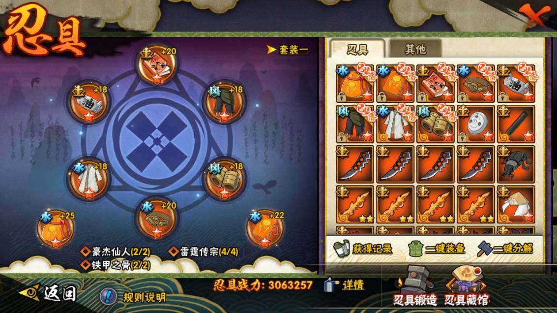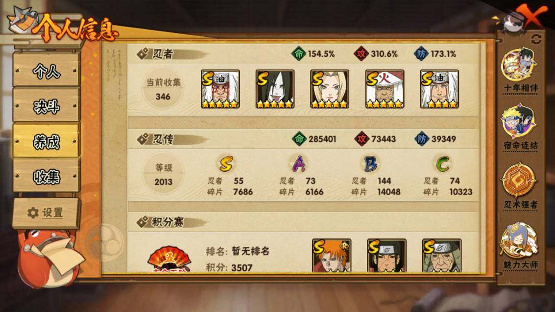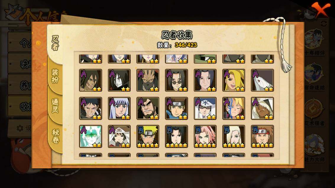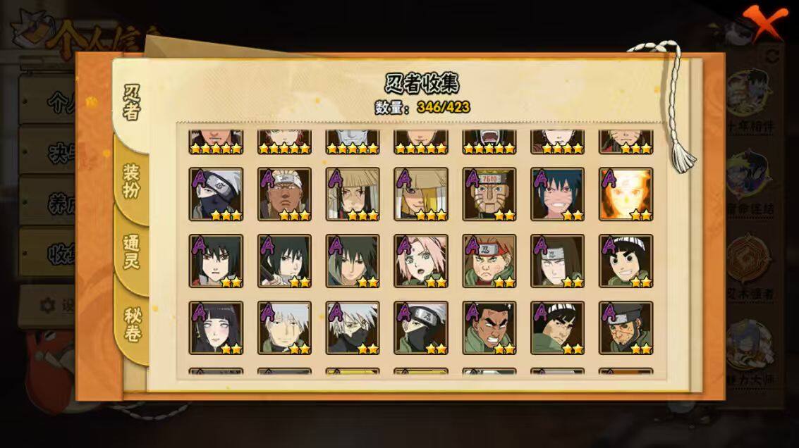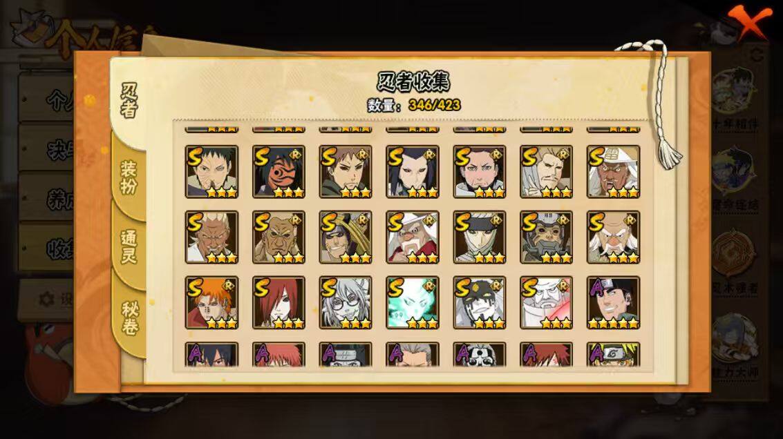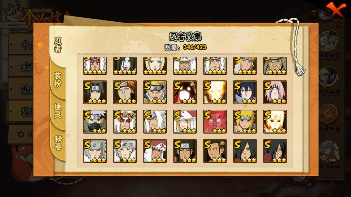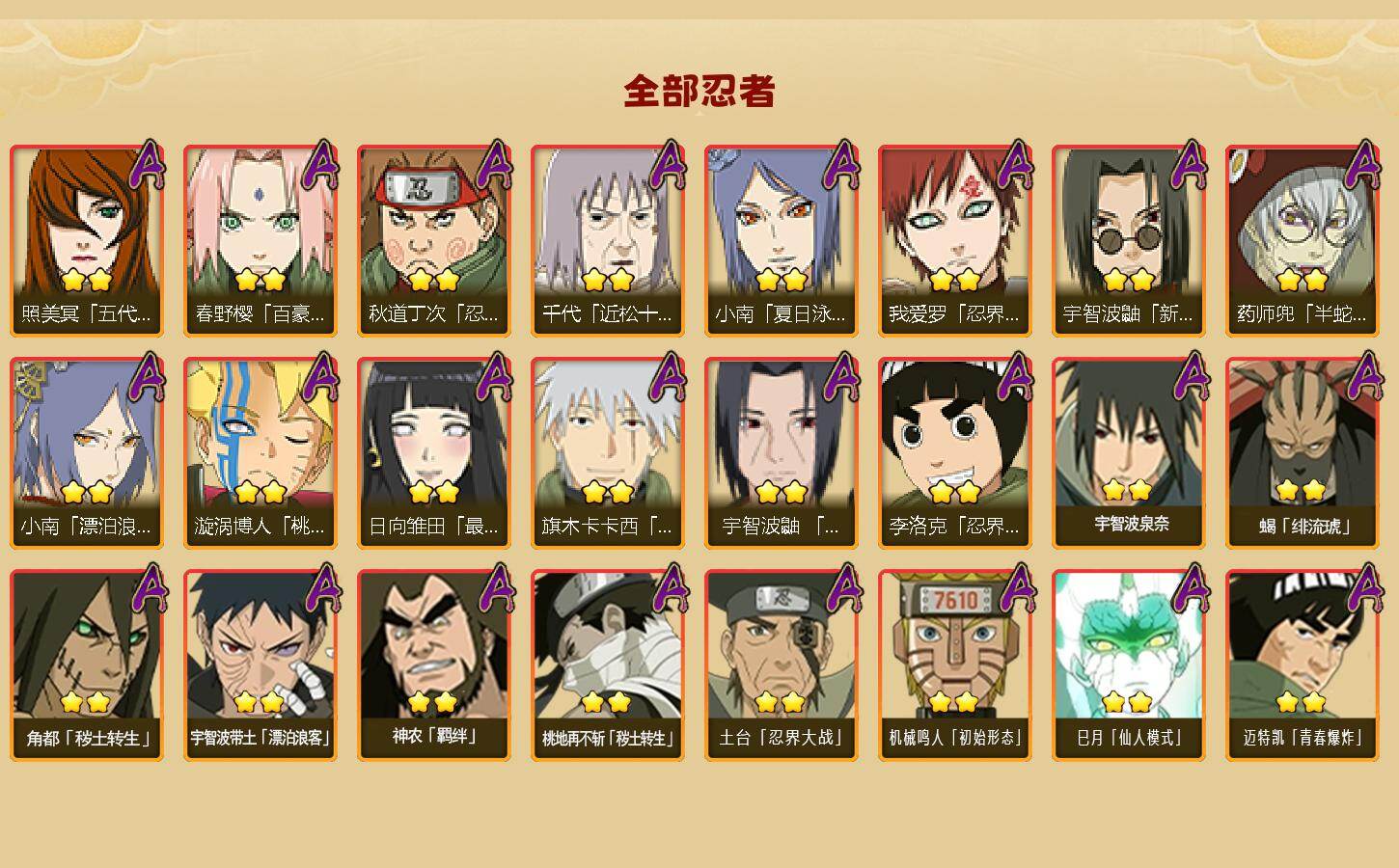 【S级忍者】:长门「秽土转生」(3星),三代目风影「秽土转生」(3星),半藏「秽土转生」(3星),金角·银角「秽土转生」(3星),猿飞日斩「秽土转生」(4星),波风水门「秽土转生」(3星),千手扉间「秽土转生」(3星),千手柱间「秽土转生」(3星),宇智波鼬「秽土转生」(3星),宇智波斑「秽土转生」(3星),宇智波斑「秽土转生·解」(3星),大野木「忍界大战」(3星),春野樱「忍界大战」(3星),宇智波带土「忍界大战」(3星),艾「忍界大战」(3星),宇智波鼬「须佐能乎」(4星),宇智波止水「须佐能乎」(3星),旗木卡卡西「须佐能乎」(3星),宇智波斑「木叶创立」(3星),千手柱间「木叶创立」(3星),无「二代目土影」(3星),艾「四代目雷影」(3星),罗砂「四代目风影」(3星),鬼灯幻月「二代目水影」(3星),大野木「三代目土影」(3星),艾「三代目雷影」(3星),烈斗「初代目风影」(3星),自来也(4星),自来也「仙人模式」(5星),自来也「舞之豪杰」(3星),大蛇丸(5星),自来也「传说中的三忍」(3星),纲手(5星),纲手「百豪」(3星),千手柱间(3星),千手扉间(3星),猿飞日斩(5星),宇智波斑(3星),波风水门(4星),药师兜「仙人模式」(3星),神秘面具男(3星),神秘面具男「红夜之刃」(3星),漩涡鸣人「九喇嘛连结」(3星),迈特凯「死门」(3星),佩恩「天道」(4星),佩恩·天道「超」(3星),宇智波佐助「永恒万花筒」(3星),宇智波斑 「白面具」(3星宇智波斑「白面具」),大筒木金式(3星),大筒木桃式(3星),大筒木舍人「最终章」(3星),漩涡鸣人「暴怒·第六尾」(3星),波风水门「九喇嘛连结」(3星),宇智波斑「五影会谈」(3星),漩涡鸣人·宇智波佐助(3星)