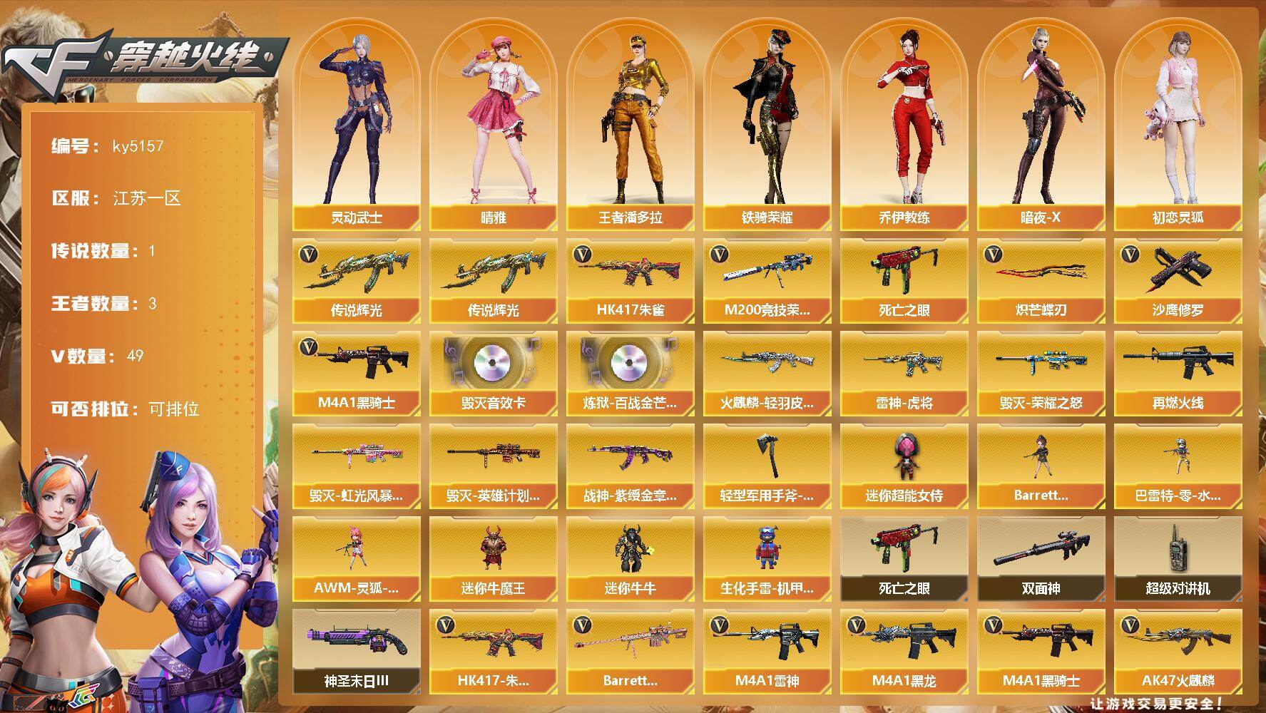 [16315248]江苏一区-52V-3王者武器数-0炫金武器数 【传说武器】:传说辉光 【热门武器】:传说辉光,HK417-朱雀,M200-竞技荣光,死亡之眼,M4A1-黑骑士,沙鹰-修罗*5,炽芒蝶刃 【音效卡】:Barrett-毁灭音效卡,炼狱-百战金芒-庆典舞曲音效卡 【皮肤】:雷神-虎将,M4A1-再燃火线,火麒麟-轻羽皮肤,毁灭-荣耀之怒,毁灭-虹光风暴 皮肤,毁灭-英雄计划 皮肤,战神-紫绶金章皮肤,轻型军用手斧-再燃火线 【角色】:晴雅,王者潘多拉,乔伊教练,暗夜-X,初恋灵狐,电竞少女,嘉年华灵狐,娟娟,0号玩家,灵动武士,灵狐者-X,龙儿,萌儿,潘多拉-甜心教官,蛇姬,铁骑荣耀,维纳斯,夜玫瑰-宠粉 【人偶武器】:巴雷特-零-水下丽影,AWM-灵狐-15周年嘉年华,迷你牛魔王,迷你牛牛*2,生化手雷-机甲核心*3,Barrett-夜玫瑰,迷你超能女侍 【暴走生化】:双面神,死亡之眼,超级对讲机 【挑战大师】:神圣爆裂者-末日III 【英雄级武器】:AK47-火麒麟,M4A1-黑龙,M4A1-雷神*2,M4A1-黑骑士,AK47-黑武士,HK417-朱雀,无影-神兵利器,黑武士-锦绣游龙,烈火-动感闪耀,AK-47-猩红传说,Barrett-毁灭,Barrett-极光,M200-竞技荣光,Barrett-金色蔷薇,王者之光-觉醒版,王者星神-觉醒版,王者凰鸣-觉醒版,炼狱-百战金芒,AA-12-雷霆,沙鹰-修罗*5,柯尔特-竞技荣光,天神-动感闪耀,屠龙,擎天,麒麟刺,擎天-竞技荣光,炽芒蝶刃,屠龙-动感闪耀,麒麟刺-百战金芒,丛林匕首-玄豹,高爆手雷-竞技荣光,手雷-动感闪耀,高爆手雷-玄豹*2,闪光弹-竞技荣光,闪光弹-玄豹*3,烟雾弹-竞技荣光,烟雾弹-玄豹*2 【道具】:BS战队炫彩背包,CFS限定背包,云山科技背包,冰冰企鹅背包,炫彩背包,百战金芒炫彩背包,超级背包,哔哩哔哩名片,女皇终结者-魔龙之吻,救世主-黑桃战神,绿色巨人,灵魂忍者,变异宝贝,迷雾幽灵*2,生化弹匣,夺命之镰,防化服*3,金色流光-枪王排位*2,星辰流光-枪王排位,流光-再燃火线,枪王排位28赛季金色流光,枪王排位29赛季金色流光,语音特效-盛典烟火,萌萌小葵表情,电玩兔兔表情,动感闪耀表情,EP战队名片,EP战队喷图,EP战队击杀图标*2,防弹头盔*4,防弹衣*4,C4工具钳*4,
