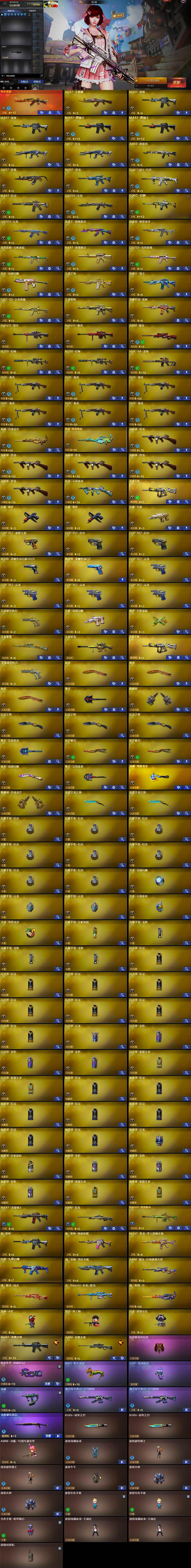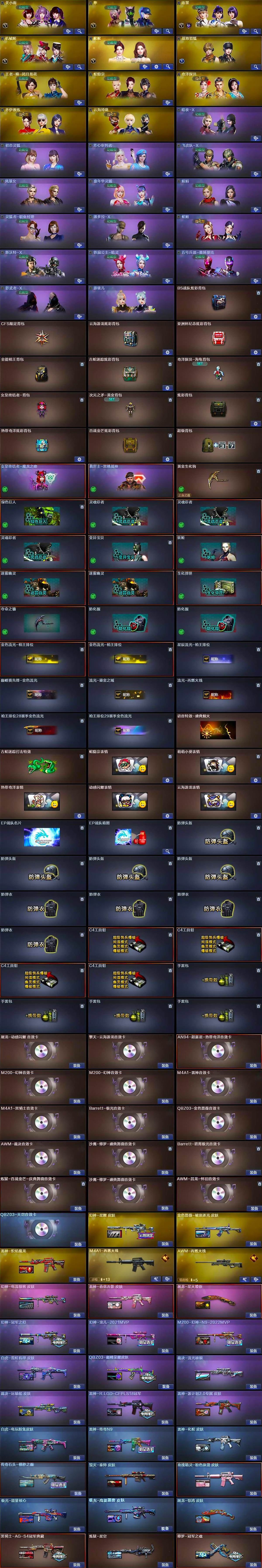 【皮肤】:幻神-冠军之幻,幻神-宠儿-2021MVP,M200-幻神-N9-2022MVP,幻神-星耀 皮肤,幻神-电流骇客 皮肤,白虎-电玩粉兔皮肤,白虎-霓虹机甲 皮肤,QBZ03-巅峰荣耀皮肤,金色蔷薇-破浪逐光 皮肤,裁决-流光秘银,裁决-运输船 皮肤,Kar98K-星神-AG-CFPLS21冠军皮肤,雷神-传奇N9,雷神-R.LGD-CFPLS18冠军,雷神-炽焰魔龙,雷神-源计划2.0专属 皮肤,雷神-化蛇 皮肤,雷神-春花弄影 皮肤,M4A1-再燃火线,传奇石头-横秒之巅,毁灭-秦师 皮肤,黑骑士-AG-S4冠军典藏,玫瑰精灵-粉色浪漫 皮肤,AWM-再燃火线,极光-能量核心,极光-高能霹雳 皮肤,炼狱-星空,修罗-冠军之魂,屠龙-星火燎原,屠龙-惊鸿 皮肤,轻型军用手斧-再燃火线