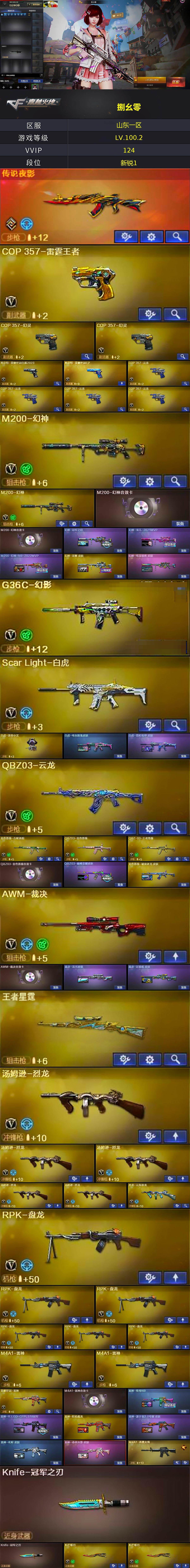 【热门武器】:传说夜影,G36C-幻影,QBZ03-金色蔷薇,Scar Light-白虎,M4A1-青龙,M200-幻神*2,柯尔特-荣耀世冠白鲨2023,金色蔷薇-古蛇迷踪,修罗-古蛇迷踪,荣耀世冠-雷神,金色小号,毒蜂,M4A1-黑骑士*2,汤姆逊-烈龙*5,RPK-盘龙*6,MK5-炽火炎龙,羊驼玩偶*2,雷神-小红,毁灭-孙三炮,COP 357-幻灵*2,沙鹰-修罗*2,Knife-冠军之刃*2,炽芒蝶刃*2