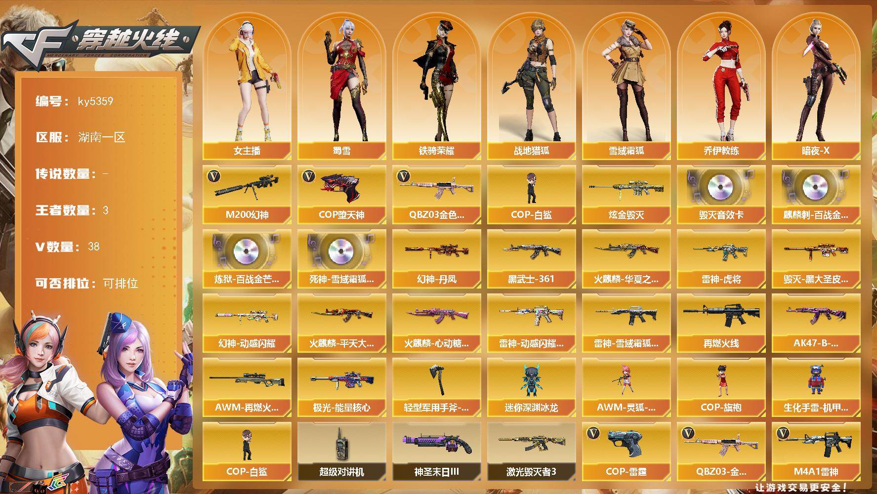 [16316263]湖南一区-40V-3王者武器数-1炫金武器数 【传说角色】:传说艾莉莎 【热门武器】:QBZ03-金色蔷薇,M200-幻神,COP-白鲨,COP-堕天神 【王者炫金武器】:炫金毁灭 【音效卡】:Barrett-毁灭音效卡,麒麟刺-百战金芒-盛典舞曲音效卡,炼狱-百战金芒-庆典舞曲音效卡,死神-雪域霜狐-怀旧音效卡 【皮肤】:幻神-丹凤,幻神-动感闪耀 皮肤,雷神-虎将,雷神-动感闪耀 皮肤,雷神-雪域霜狐 皮肤,M4A1-再燃火线,火麒麟-华夏之心,火麒麟-平天大圣,火麒麟-心动糖果,毁灭-黑大圣皮肤,AK47-黑武士-361,AK47-B-常胜将军-曹操,AWM-再燃火线,极光-能量核心,轻型军用手斧-再燃火线 【角色】:战地猎狐,雪域霜狐,乔伊教练,暗夜-X,风暴女,虎妞,嘉年华灵狐,娟娟,灵狐者-X,麻雀,曼陀罗-X,女主播,潘多拉-X,潜龙队-X,斯沃特-X,蜀雪,铁骑荣耀,兔囡囡,新娜塔莎,雪莉杨-摸金校尉,游珑儿 【人偶武器】:COP-白鲨,AWM-灵狐-15周年嘉年华,COP-旗袍,迷你深渊冰龙,生化手雷-机甲核心 【暴走生化】:超级对讲机 【挑战大师】:激光毁灭者III,神圣爆裂者-末日III 【英雄级武器】:AK47-火麒麟*2,M4A1-雷神,无影-神兵利器,黑武士-锦绣游龙,死神-雪域霜狐,QBZ03-金色蔷薇,烈火-动感闪耀,王者之势-觉醒版,AK-47-猩红传说,白虎之魄-觉醒版,Barrett-毁灭,AWM-裁决,M200-幻神,炼狱-百战金芒,COP-雷霆,COP-堕天神,USP-神工天巧,天神-动感闪耀,屠龙,擎天,屠龙-动感闪耀*2,麒麟刺-百战金芒,王者之刺-觉醒版,高爆手雷-神工天巧*2,手雷-动感闪耀,闪光弹-神工天巧*2,烟雾弹-神工天巧*3,M4A1-赤狱骑士,M4A1-苍鸣雷神 【道具】:云山科技背包,全能枪王背包,女皇终结者-背包,战舰背包,炫彩背包,百战金芒炫彩背包,雪域霜狐炫彩背包,哔哩哔哩名片,女皇终结者-魔龙之吻,救世主-黑桃战神,绿色巨人,灵魂忍者,变异宝贝,迷雾幽灵,夺命之镰,防化服*3,金色流光-枪王排位*2,星辰流光-枪王排位,流光-鎏金之域,流光-再燃火线,枪王排位28赛季金色流光,语音特效-盛典烟火,语音特效-怀旧,雪域霜狐表情,萌萌小葵表情,电玩兔兔表情,热带奇洋表情,动感闪耀表情,防弹头盔*6