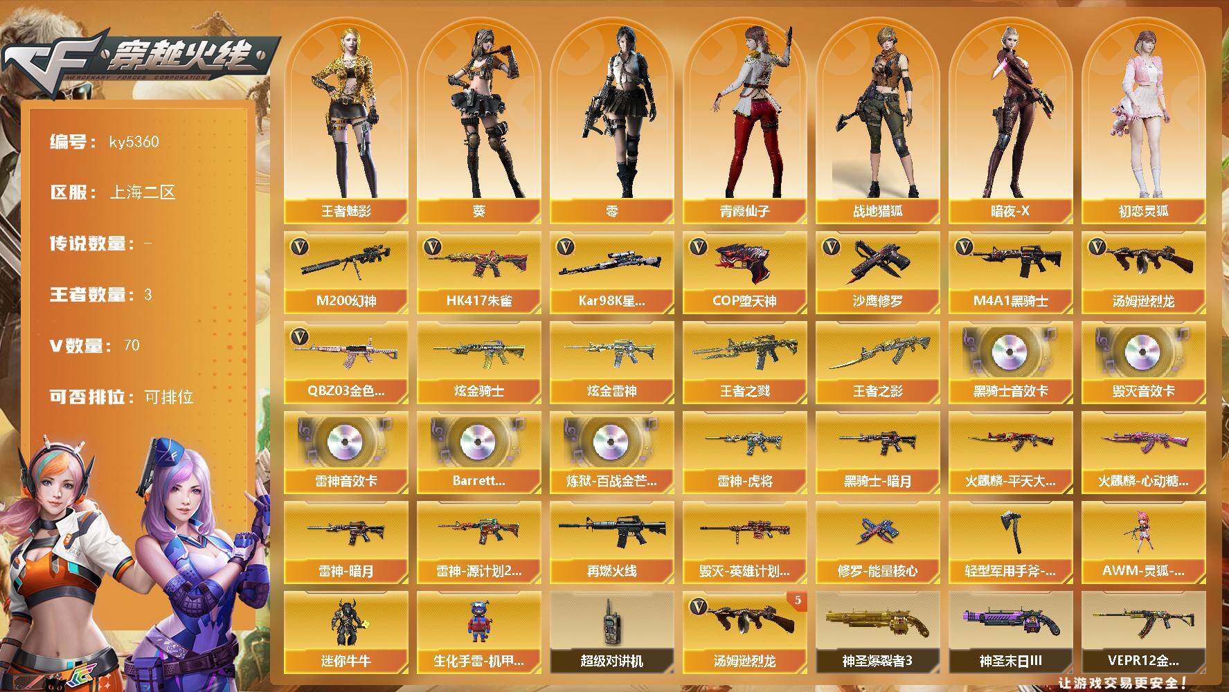 [16316584]上海二区-72V-3王者武器数-2炫金武器数 【热门武器】:QBZ03-金色蔷薇,HK417-朱雀,M200-幻神,Kar98K-星神,M4A1-黑骑士,汤姆逊-烈龙*5,COP-堕天神,沙鹰-修罗*3 【王者炫金武器】:王者之戮,王者之影,炫金骑士,炫金雷神 【音效卡】:M4A1-雷神音效卡,M4A1-黑骑士音效卡,Barrett-毁灭音效卡,Barrett-碧霄极光音效卡,炼狱-百战金芒-庆典舞曲音效卡 【皮肤】:雷神-暗月,雷神-虎将,雷神-源计划2.0专属 皮肤,M4A1-再燃火线,火麒麟-平天大圣,火麒麟-心动糖果,毁灭-英雄计划 皮肤,黑骑士-暗月,修罗-能量核心,轻型军用手斧-再燃火线 【角色】:零,葵,战地猎狐,王者-魅影,暗夜-X,初恋灵狐,飞虎队-X,风暴女,虎妞,嘉年华灵狐,娟娟,兰-新年限定,灵狐者-X,龙儿-小淘气,麻雀,潘多拉-X,青霞仙子,斯沃特-X,兔囡囡,雪莉杨,影武者-X,游珑儿 【人偶武器】:AWM-灵狐-15周年嘉年华,迷你牛牛,生化手雷-机甲核心 【暴走生化】:超级对讲机 【挑战大师】:神圣爆裂者III,冰龙粉碎者-白马银枪,激光毁灭者III-白马银枪,VEPR-12-金魔,神圣爆裂者-末日III 【英雄级武器】:M4A1-千变,AK47-火麒麟*2,M4A1-雷神*2,M4A1-黑骑士,AK47-黑武士,AK12-天启*2,HK417-朱雀,M4A1-夜魔,无影-神兵利器,黑武士-锦绣游龙,QBZ03-金色蔷薇,王者之心-觉醒版,Barrett-毁灭,M200-幻神,Kar98K-星神,炼狱-百战金芒,汤姆逊-烈龙*5,沙鹰-修罗*3,沙鹰-天神*2,COP-堕天神,破空枪刃-夜魔,柯尔特-电竞之星,屠龙,龙啸,马来剑-夜魔,擎天,麒麟刺,斩神刀-雷暴,麒麟刺-百战金芒,高爆手雷-雷暴*2,高爆手雷-夜魔*5,高爆手雷-幻灵,闪光弹-雷暴*2,闪光弹-夜魔*5,烟雾弹-雷暴*2,烟雾弹-夜魔*5,M4A1-赤狱骑士 【道具】:BS战队炫彩背包,CFS限定背包,云山科技背包,亚洲杯纪念炫彩背包,全能枪王背包,百战金芒炫彩背包,女皇终结者-魔龙之吻,救世主-黑桃战神,绿色巨人,灵魂忍者,迷雾幽灵,夺命之镰,防化服*3,金色流光-枪王排位*2,星辰流光-枪王排位,流光-再燃火线,枪王排位28赛季金色流光,枪王排位29赛季金色流