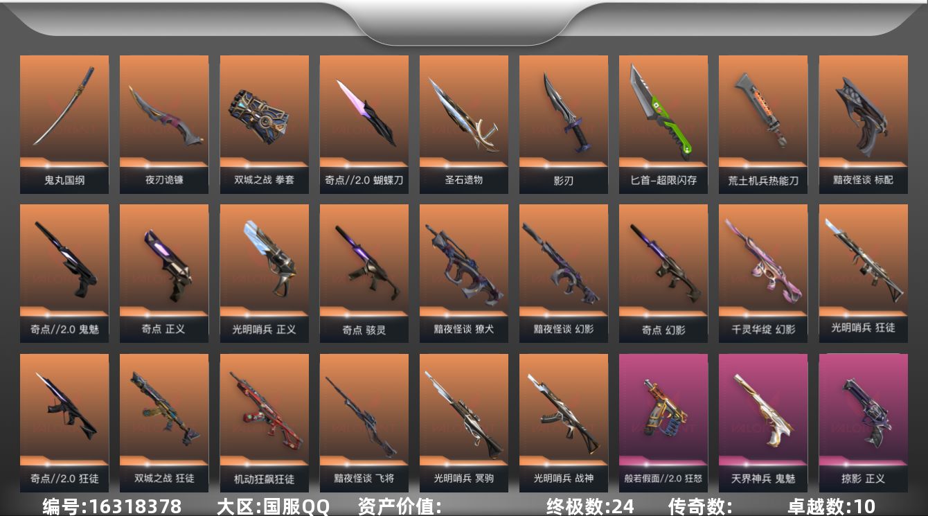 [16318378]【套装】:《双城之战》收藏套装,光明哨兵套装,奇点//2.0套装,黯夜怪谈套装,回火礼包:奇点套装,般若假面//2.0套装,掠影套装 【英雄】:炼狱,维斯,暮蝶,壹决,铁臂,捷风,不死鸟,贤者,猎枭,蝰蛇,芮娜,奇乐,尚勃勒,霓虹,盖可,黑梦,钢锁 【近战 武器】:近战武器-鬼丸国纲,近战武器-双城之战 拳套,近战武器-超限闪存 匕首,近战武器-荒土机兵 热能刀,近战武器-奇点//2.0 蝴蝶刀,近战武器-圣石遗物,近战武器-夜刃诡镰,近战武器-影刃 【标配】:标配-黯夜怪谈,标配-荒土机兵,标配-浮光跃金 【狂怒】:狂怒-般若假面//2.0,狂怒-逆冲蛮牛 【鬼魅】:鬼魅-奇点//2.0,鬼魅-天界神兵,鬼魅-模拟赫兹 【正义】:正义-光明哨兵,正义-奇点,正义-掠影,正义-超限闪存,正义-纳米打击 【蜂刺】:蜂刺-超限闪存 【骇灵】:骇灵-奇点,骇灵-荒土机兵,骇灵-浮光跃金 【雄鹿】:雄鹿-模拟赫兹,雄鹿-逆冲蛮牛 【判官】:判官-纳米打击x 【獠犬】:獠犬-黯夜怪谈,獠犬-般若假面//2.0,獠犬-模拟赫兹,獠犬-逆冲蛮牛 【戍卫】:戍卫-掠影,戍卫-浮光跃金,戍卫-逆冲蛮牛 【幻影】:幻影-黯夜怪谈,幻影-奇点,幻影-千灵华绽,幻影-侦察力量,幻影-超限闪存,幻影-纳米打击 【狂徒】:狂徒-光明哨兵,狂徒-机动狂飙,狂徒-奇点//2.0,狂徒-双城之战,狂徒-般若假面//2.0,狂徒-掠影,狂徒-荒土机兵 【飞将】:飞将-黯夜怪谈 【冥驹】:冥驹-光明哨兵,冥驹-掠影,冥驹-荒土机兵,冥驹-模拟赫兹 【莽侠】:莽侠-超限闪存 【战神】:战神-光明哨兵,战神-般若假面//2.0,战神-浮光跃金 【奥丁】:奥丁-纳米打击 【卡面】:终章:激斗汉堡 卡面,进入射程 卡面,分崩离析 卡面,纳米打击 卡面,抑制技术 卡面,激斗汉堡 卡面,瓦娃脸雪糕 P2 卡面,从黄昏到黎明 卡面,荒土机兵 卡面,银弹猎手 卡面,逆冲蛮牛 卡面,《双城之战》拥抱 卡面,精灵大战 卡面,欢迎来到底城 卡面,南瓜盛典 卡面,VCT CN首冠 卡面,唱片的故事 卡面,钢弓与箭弦 卡面,排除故障 卡面,奇点//2.0 卡面,战术桌游 卡面,悠享食光 卡面,修车达人 卡面,热舞环节 卡面,模拟赫兹 卡面,浮光跃金 卡面,超限闪存 卡面,维斯工牌 卡面,正义的化身 卡面,无畏契约GO!第一卷: