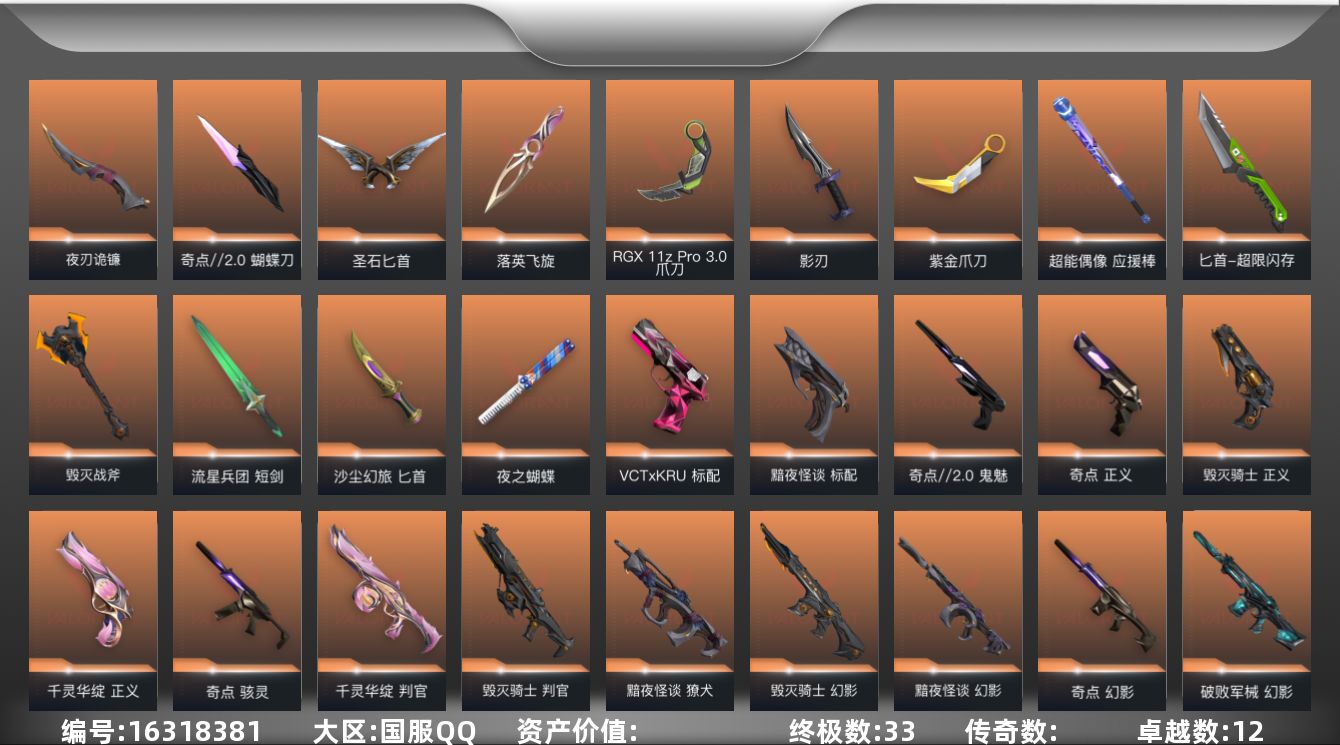 [16318381]【套装】:千灵华绽套装,奇点//2.0套装,黯夜怪谈套装,毁灭骑士套装,回火礼包:奇点套装,掠影套装 【英雄】:炼狱,维斯,暮蝶,壹决,铁臂,捷风,雷兹,幽影,不死鸟,贤者,猎枭,蝰蛇,零,芮娜,奇乐,尚勃勒,霓虹,斯凯,夜露,星礈,K/O,盖可,黑梦,钢锁 【近战 武器】:近战武器-RGX 11z Pro//3.0 爪刀,近战武器-超能偶像 应援棒,近战武器-超限闪存 匕首,近战武器-毁灭战斧,近战武器-流星兵团 短剑,近战武器-落英飞旋,近战武器-奇点//2.0 蝴蝶刀,近战武器-沙尘幻旅 匕首,近战武器-圣石匕首,近战武器-夜刃诡镰,近战武器-夜之蝴蝶,近战武器-影刃,近战武器-紫金爪刀 【标配】:标配-黯夜怪谈,标配-超能偶像,标配-荒土机兵,标配-浮光跃金,标配-战术熊与伙伴们,标配-最终庇护 【VCT手枪】:标配-VCT x KRÜ 【短炮】:短跑-纤云弄巧 【狂怒】:狂怒-紫阙金琅//2.0,狂怒-聚合之力,狂怒-萌彩剪影,狂怒-逆冲蛮牛,狂怒-战术熊与伙伴们 【鬼魅】:鬼魅-奇点//2.0,鬼魅-灵魂冲击,鬼魅-流星兵团,鬼魅-采蜜小蜂队,鬼魅-光导纤维,鬼魅-胡桃狂想,鬼魅-模拟赫兹 【正义】:正义-毁灭骑士,正义-奇点,正义-千灵华绽,正义-掠影,正义-超限闪存,正义-沙尘幻旅,正义-复古浪潮,正义-纤云弄巧 【蜂刺】:蜂刺-超限闪存,蜂刺-胡桃狂想,蜂刺-聚合之力,蜂刺-纤云弄巧 【骇灵】:骇灵-奇点,骇灵-荒土机兵,骇灵-流星兵团,骇灵-沙尘幻旅,骇灵-浮光跃金 【雄鹿】:雄鹿-模拟赫兹,雄鹿-逆冲蛮牛 【判官】:判官-毁灭骑士,判官-千灵华绽,判官-超能偶像,判官-采蜜小蜂队,判官-萌彩剪影,判官-纳米打击x 【獠犬】:獠犬-黯夜怪谈,獠犬-采蜜小蜂队,獠犬-胡桃狂想,獠犬-模拟赫兹,獠犬-逆冲蛮牛 【戍卫】:戍卫-掠影,戍卫-紫阙金琅,戍卫-超能偶像,戍卫-浮光跃金,戍卫-萌彩剪影,戍卫-逆冲蛮牛,戍卫-战术熊与伙伴们 【幻影】:幻影-黯夜怪谈,幻影-毁灭骑士,幻影-破败军械,幻影-奇点,幻影-千灵华绽,幻影-侦察力量,幻影-超限闪存,幻影-聚合之力 【狂徒】:狂徒-混沌序曲,狂徒-奇点//2.0,狂徒-掠影,狂徒-盖亚的复仇,狂徒-紫阙金琅,狂徒-超能偶像,狂徒-流星兵团,狂徒-沙尘幻旅 【飞将】:飞将-黯夜怪谈,飞将-沙尘幻旅,飞将