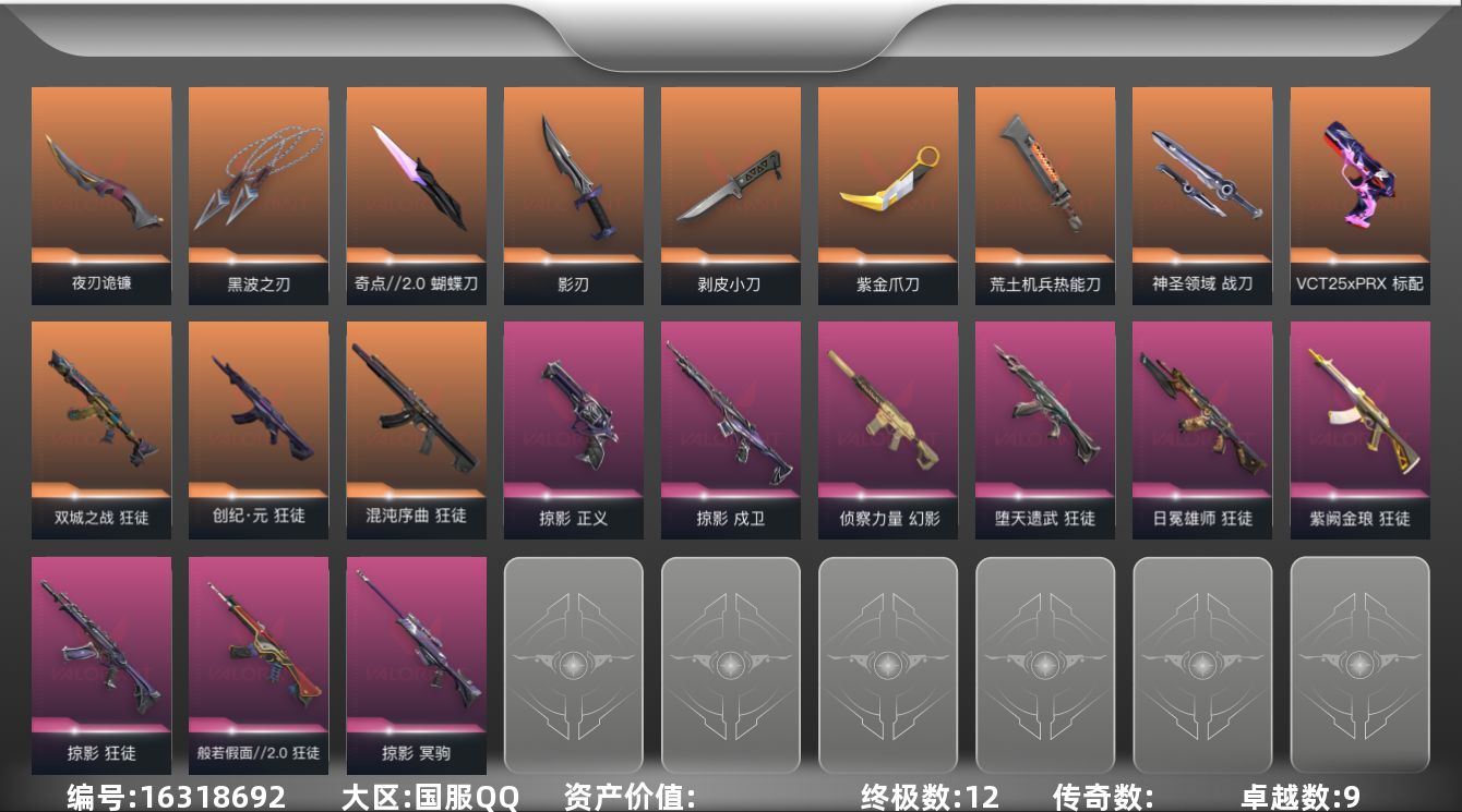 [16318692]【套装】:掠影套装 【英雄】:幻棱,炼狱,维斯,暮蝶,钛狐,壹决,铁臂,捷风,雷兹,幽影,不死鸟,贤者,猎枭,蝰蛇,零,芮娜,奇乐,尚勃勒,霓虹,斯凯,夜露,星礈,K/O,海神,盖可,黑梦,钢锁 【近战 武器】:近战武器-剥皮小刀,近战武器-奇点//2.0 蝴蝶刀,近战武器-紫金爪刀,近战武器-黑波之刃,近战武器-荒土机兵 热能刀,近战武器-夜刃诡镰,近战武器-影刃,近战武器-神圣领域 战刀 【狂徒】:狂徒-混沌序曲,狂徒-双城之战,狂徒-创·纪元,狂徒-般若假面//2.0,狂徒-堕天遗武,狂徒-掠影,狂徒-日冕雄师,狂徒-紫阙金琅,狂徒-荒土机兵 【幻影】:幻影-侦察力量,幻影-神圣领域,幻影-纳米打击 【戍卫】:戍卫-掠影,戍卫-逆冲蛮牛,戍卫-月球哨兵 【獠犬】:獠犬-神圣领域,獠犬-逆冲蛮牛 【冥驹】:冥驹-掠影,冥驹-荒土机兵,冥驹-星云暗涌 【莽侠】:莽侠-月球哨兵 【战神】:战神-神圣领域 【奥丁】:奥丁-纳米打击 【判官】:判官-纳米打击x 【雄鹿】:雄鹿-逆冲蛮牛,雄鹿-月球哨兵 【骇灵】:骇灵-荒土机兵,骇灵-星云暗涌 【蜂刺】:蜂刺-星云暗涌 【标配】:标配-荒土机兵 【VCT手枪】:标配-VCT25 x PRX 【正义】:正义-掠影,正义-超限闪存,正义-纳米打击,正义-月球哨兵 【鬼魅】:鬼魅-星云暗涌 【狂怒】:狂怒-神圣领域,狂怒-逆冲蛮牛 【卡面】:终章:激斗汉堡 卡面,进入射程 卡面,分崩离析 卡面,纳米打击 卡面,抑制技术 卡面,激斗汉堡 卡面,瓦娃脸雪糕 P2 卡面,从黄昏到黎明 卡面,荒土机兵 卡面,银弹猎手 卡面,逆冲蛮牛 卡面,《双城之战》拥抱 卡面,精灵大战 卡面,欢迎来到底城 卡面,南瓜盛典 卡面,修车达人 卡面,正义的化身 卡面,梦幻奶茶 卡面,战术熊与伙伴们 卡面,沙雕爆能器 卡面,无畏契约GO!第一卷:芮娜 卡面,清除名单 卡面,无畏契约GO!第一卷:零 卡面,暗枪 卡面,夯实根基 卡面,"Luie" 卡面,热烈欢迎 卡面,铁臂设计图 卡面,代号红色 卡面,冰淇淋店 卡面,新兵报到 卡面,V契约 卡面,无畏契约 卡面 【喷漆】:小小心意 喷漆,战“素”兔 喷漆,宇宙的指引 喷漆,请求重启 喷漆,逆冲蛮牛 喷漆,纳米打击 喷漆,鼻尖上的蝴蝶 喷漆,简笔画黯兽 喷漆,独守蝰腹 喷漆,他们将落荒而逃 喷漆,通缉:战术