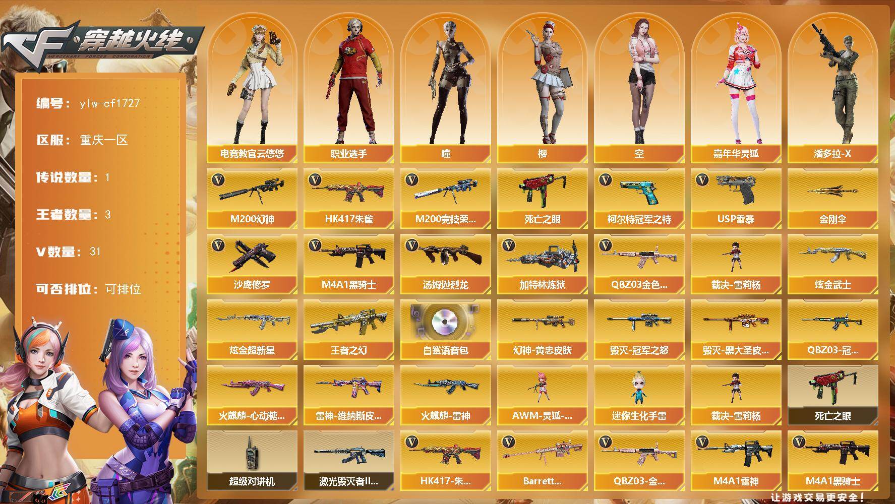 [16318679]重庆一区-31V-3王者-2炫金 【传说角色】:传说星骇 【热门武器】:QBZ03-金色蔷薇,HK417-朱雀,M200-幻神,M200-竞技荣光,死亡之眼,柯尔特-冠军之特,M4A1-黑骑士,汤姆逊-烈龙,加特林-炼狱,裁决-雪莉杨,USP-雷暴,沙鹰-修罗*3,金刚伞 【王者炫金武器】:王者之幻,炫金武士,炫金超新星 【音效卡】:白鲨语音包 【皮肤】:M200-幻神-黄忠皮肤,QBZ03-冠军之薇,雷神-维纳斯皮肤,火麒麟-雷神,火麒麟-心动糖果,毁灭-冠军之怒,毁灭-黑大圣皮肤 【角色】:樱,瞳,电竞教官-云悠悠,空,嘉年华灵狐,潘多拉-X,赛斯-X,斯沃特-X,影武者-X,职业选手 【人偶武器】:裁决-雪莉杨,AWM-灵狐-15周年嘉年华,迷你生化手雷 【暴走生化】:死亡之眼,超级对讲机 【挑战大师】:激光毁灭者III-白马银枪 【英雄级武器】:AK47-火麒麟,M4A1-雷神*2,M4A1-黑骑士,HK417-朱雀,无影-神兵利器,QBZ03-金色蔷薇,王者之魄-觉醒版,Barrett-毁灭,M200-幻神,M200-竞技荣光,Barrett-金色蔷薇,王者之决-觉醒版,加特林-炼狱,汤姆逊-烈龙,沙鹰-修罗*3,USP-雷暴,柯尔特-冠军之特,柯尔特-竞技荣光,屠龙*3,麒麟刺,擎天-竞技荣光,高爆手雷-竞技荣光,闪光弹-竞技荣光*2,烟雾弹-竞技荣光 【道具】:BS战队炫彩背包,女皇终结者-魔龙之吻,变异宝贝,夺命之镰,防化服,金色流光-枪王排位*2,防弹头盔*3,防弹衣*3,C4工具钳*3,手雷包*3 【特殊枪械】:1黑骑士,1烈龙,1炼狱