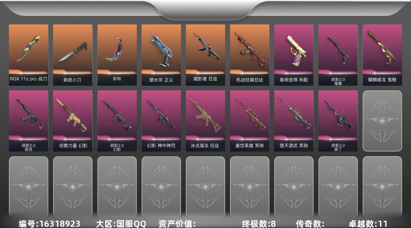 [16318923]【套装】:掠影//2.0套装 【英雄】:炼狱,暮蝶,钛狐,壹决,铁臂,捷风,幽影,不死鸟,贤者,猎枭,蝰蛇,零,芮娜,奇乐,尚勃勒,霓虹,斯凯,夜露,K/O,盖可,黑梦 【近战 武器】:近战武器-剥皮小刀,近战武器-RGX 11z Pro 战刀,近战武器-影钩 【狂徒】:狂徒-机动狂飙,狂徒-噬影者,狂徒-冰点凝冻,狂徒-诡秘蛇影 【幻影】:幻影-侦察力量,幻影-神中神罚,幻影-掠影//2.0,幻影-末日之翼 【戍卫】:戍卫-折光棱晶 【冥驹】:冥驹-堕天遗武,冥驹-盖世英雄 【飞将】:飞将-末日之翼 【莽侠】:莽侠-诡秘蛇影 【奥丁】:奥丁-掠影//2.0,奥丁-末日之翼 【判官】:判官-诡秘蛇影 【骇灵】:骇灵-掠影//2.0 【蜂刺】:蜂刺-折光棱晶 【标配】:标配-紫阙金琅,标配-折光棱晶 【正义】:正义-塑水宗 【鬼魅】:鬼魅-耀鳞威龙,鬼魅-掠影//2.0 【短炮】:短炮-末日之翼 【卡面】:欢迎来到底城 卡面,南瓜盛典 卡面,无畏契约:暮蝶 卡面,正义的化身 卡面,最高舞台 卡面,红鳞松叶 卡面,梦幻奶茶 卡面,无畏契约GO!第一卷:芮娜 卡面,无畏契约GO!第一卷:零 卡面,无垠星环 卡面,《双城之战》金克丝 卡面,无畏契约GO!第一卷:贤者 卡面,钢锁vs盖可 卡面,别冒尖 卡面,代号红色 卡面,新兵报到 卡面,V契约 卡面,无畏契约 卡面 【喷漆】:都算到了 喷漆,伤心心 喷漆,超级粉丝 喷漆,捷风差距 喷漆,买装还是存钱 喷漆,无畏契约GO!第一卷:贤者 喷漆,胜利属于无畏契约 喷漆,GLHF 喷漆,无畏契约 喷漆 【挂饰】:第九季//第三幕 纪念币 挂饰,第九季//第二幕 纪念币 挂饰,薰衣草之心 挂饰,袖珍捷风 挂饰,Z世代特饮 挂饰,第九季//第一幕 纪念币 挂饰,天外飞客 挂饰,《双城之战》魄罗 挂饰,无畏契约 纪念币 挂饰