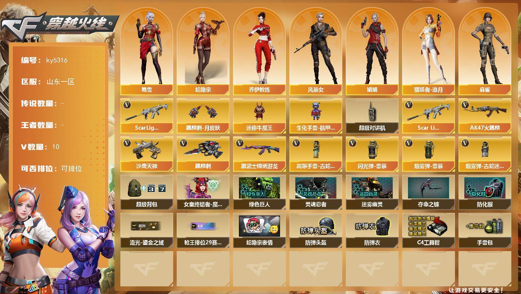 [16318998]山东一区-11V-0王者武器数-0炫金武器数 【热门武器】:Scar Light-白虎 【皮肤】:麒麟刺-月皮肤 【角色】:蛇隐宗,乔伊教练,风暴女,娟娟,猎狐者-追月,0号玩家,麻雀,潘多拉-X,潘多拉-甜心教官,潜龙队-X,蛇姬,蜀雪 【人偶武器】:迷你牛魔王,生化手雷-机甲核心 【暴走生化】:超级对讲机 【英雄级武器】:AK47-火麒麟,Scar Light-白虎,黑武士-锦绣游龙,沙鹰-天神,麒麟刺,高爆手雷-古蛇迷踪,闪光弹-雷暴,烟雾弹-雷暴,烟雾弹-古蛇迷踪 【道具】:超级背包,女皇终结者-魔龙之吻,绿色巨人,灵魂忍者,迷雾幽灵,夺命之镰,防化服*2,流光-鎏金之域,枪王排位28赛季金色流光,枪王排位29赛季金色流光,蛇隐宗表情,防弹头盔*2,防弹衣*3,C4工具钳,手雷包*3 【特殊枪械】:1白虎