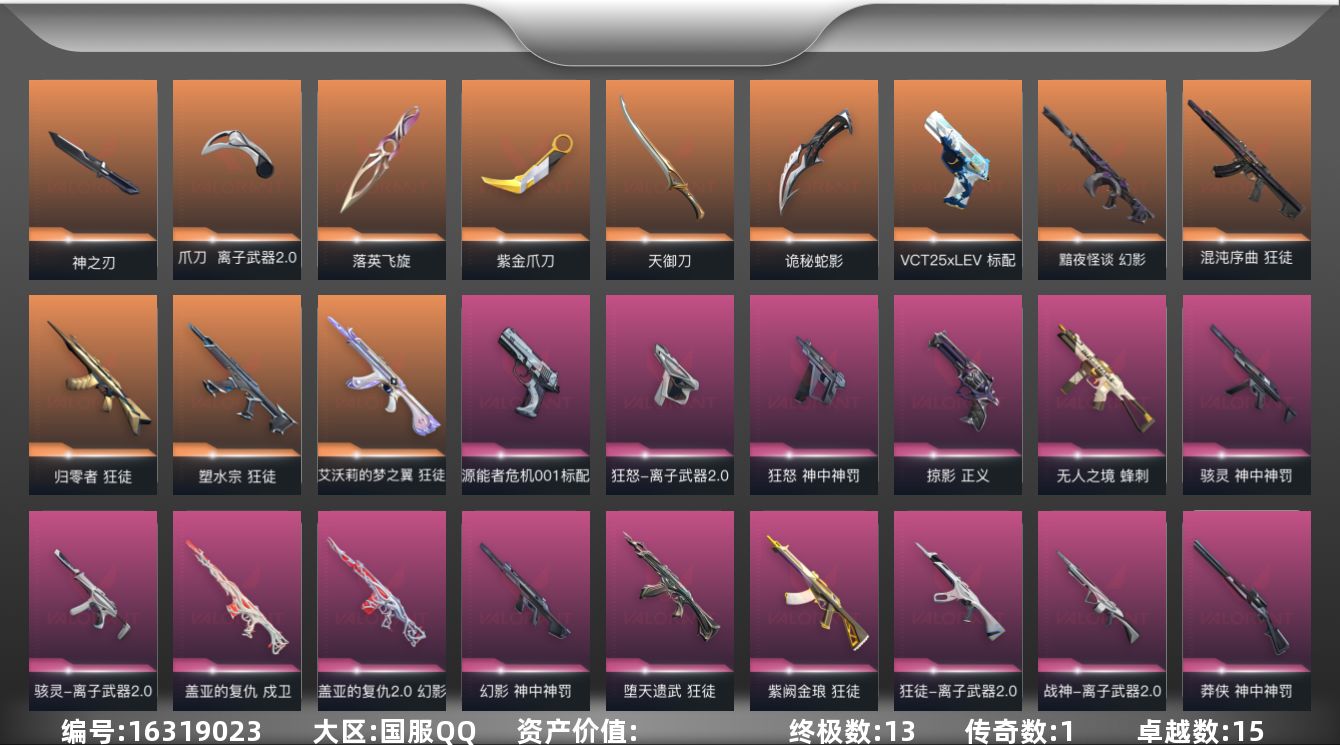 [16319023]【套装】:离子武器//2.0套装,神中神罚套装 【英雄】:幻棱,炼狱,维斯,暮蝶,钛狐,壹决,捷风,雷兹,不死鸟,贤者,猎枭,蝰蛇,零,芮娜,奇乐,斯凯,夜露,K/O,盖可,黑梦,钢锁 【近战 武器】:近战武器-紫金爪刀,近战武器-神之刃,近战武器-落英飞旋,近战武器-离子武器//2.0 爪刀,近战武器-天御刀,近战武器-诡秘蛇影 军刀 【狂徒】:狂徒-艾沃莉的梦之翼,狂徒-归零者,狂徒-混沌序曲,狂徒-塑水宗,狂徒-堕天遗武,狂徒-紫阙金琅,狂徒-离子武器//2.0,狂徒-诡秘蛇影 【幻影】:幻影-黯夜怪谈,幻影-盖亚的复仇//2.0,幻影-神中神罚,幻影-末日之翼 【戍卫】:戍卫-盖亚的复仇,戍卫-折光棱晶 【獠犬】:獠犬-星航勇进 【冥驹】:冥驹-虎魄春明 【飞将】:飞将-末日之翼 【莽侠】:莽侠-神中神罚,莽侠-诡秘蛇影 【战神】:战神-离子武器//2.0 【奥丁】:奥丁-末日之翼 【判官】:判官-诡秘蛇影 【骇灵】:骇灵-离子武器//2.0,骇灵-神中神罚 【蜂刺】:蜂刺-无人之境,蜂刺-折光棱晶 【标配】:标配-源能者危机001,标配-折光棱晶 【VCT手枪】:标配-VCT25 x LEV 【正义】:正义-掠影 【鬼魅】:鬼魅-诡秘蛇影 【狂怒】:狂怒-离子武器//2.0,狂怒-神中神罚 【短炮】:短炮-末日之翼 【卡面】:热舞环节 卡面,树懒大作战 卡面,红鳞松叶 卡面,沙雕爆能器 卡面,无畏契约GO!第一卷:芮娜 卡面,无畏契约GO!第一卷:零 卡面,无垠星环 卡面,《双城之战》金克丝 卡面,钢锁vs盖可 卡面,代号红色 卡面,新兵报到 卡面,V契约 卡面,无畏契约 卡面 【喷漆】:审判之爪 喷漆,买装还是存钱 喷漆,关门放狗 喷漆,放下武器 喷漆,胜利属于无畏契约 喷漆,GLHF 喷漆,无畏契约 喷漆 【挂饰】:无畏契约GO!第一卷 芮娜 挂饰,薰衣草之心 挂饰,动力机箱 挂饰,招财猫熊 挂饰,天外飞客 挂饰,红鳞松叶 挂饰,《双城之战》魄罗 挂饰,盆栽小友 挂饰,无畏契约 纪念币 挂饰