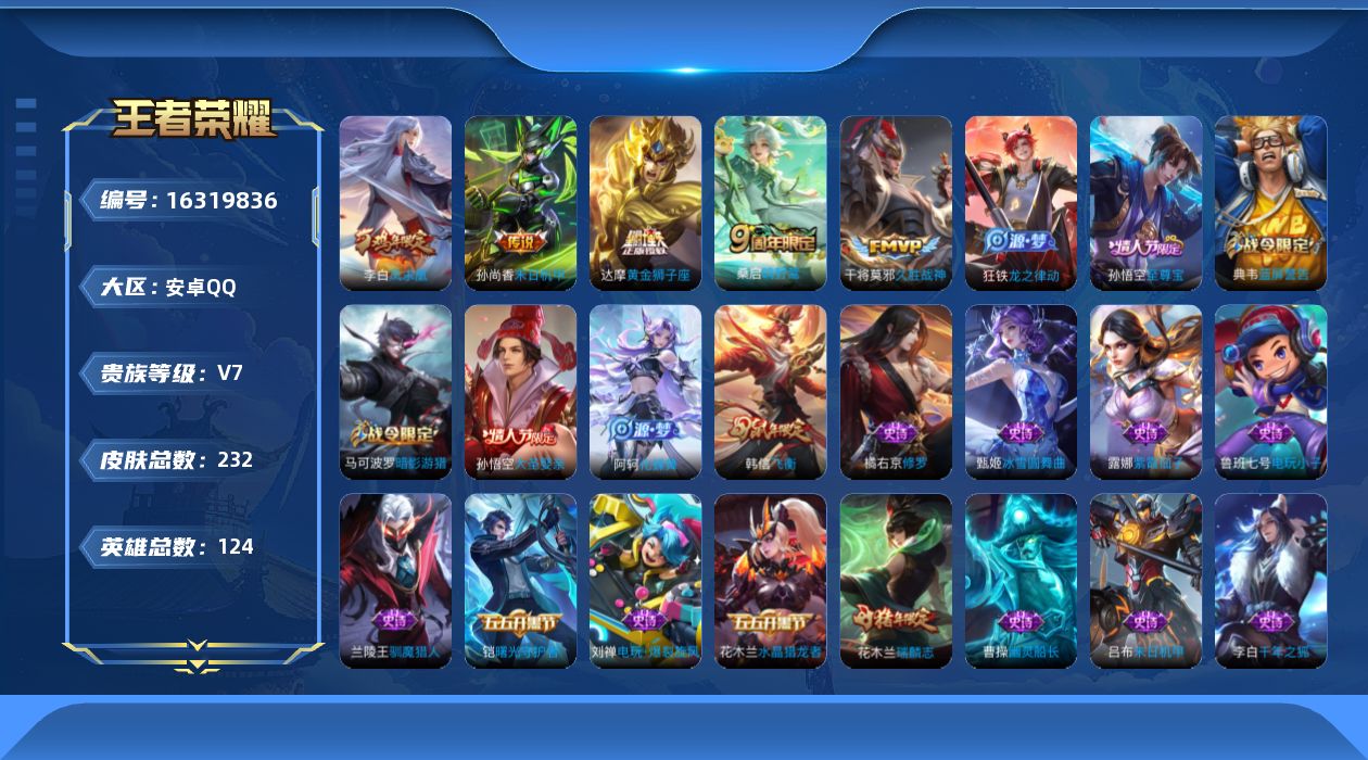 [16319836]安卓Q-V7-最强王者段位-124英雄-232皮肤-0典藏-0珍品无双-0无双-0珍品传说-5传说-52史诗