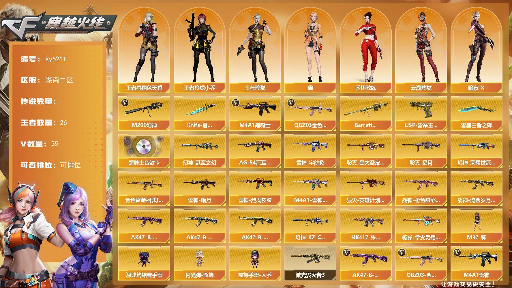 [16320069]湖南二区-46V-26王者武器数-0炫金武器数 【热门武器】:QBZ03-金色蔷薇,M200-幻神,M4A1-黑骑士,Knife-冠军之刃*2 【王者炫金武器】:Barrett-雷霆王者,USP-雷暴王者,雷霆王者之锋 【音效卡】:M4A1-黑骑士音效卡 【皮肤】:幻神-冠军之幻,M200-幻神-荣耀世冠白鲨,幻神-KZ-CFPLS25冠军 皮肤,金色蔷薇-纸灯龙皮肤,雷神-暗月,雷神-烈虎皮肤,雷神-宇航兔皮肤,M4A1-雷神-巅峰荣耀皮肤,毁灭-暗月,毁灭-黑大圣皮肤,毁灭-英雄计划 皮肤,黑骑士-AG-S4冠军典藏,HK417-朱雀-掌火灵橙 皮肤,战神-粉色甜心皮肤,战神-流金岁月皮肤,AK47-B-常胜将军-曹操,AK47-B-常胜将军-刘备,AK47-B-常胜将军-孙权,极光-掌火灵耀 皮肤 【角色】:王者-零-国色天香,王者玲珑,王者玲珑-小乔,乔伊教练,云海玲珑,暗夜-X,风暴女,虎妞,娟娟,灵狐者-X,龙儿-小淘气,曼陀罗-X,潘多拉-X,潘多拉-甜心教官,雪莉杨-摸金校尉,夜玫瑰-幻能朋克,影武者-X,幽 【人偶武器】:M37-葵,深渊终结者手雷,闪光弹-貂蝉,高爆手雷-大乔 【挑战大师】:激光毁灭者III 【英雄级武器】:M4A1-雷神,M4A1-黑骑士,M4A1-玫瑰精灵,QBZ03-金色蔷薇,AK47-B-战神,AK47-B-常胜将军,王者白虎-觉醒版,M4A1-雷霆王者-觉醒版,黑武士-CF网剧冠军,Barrett-毁灭,Barrett-极光,M200-幻神,王者幻神-觉醒版,COP 357-雷霆王者-觉醒版*2,柯尔特-电竞装甲,天神-CF网剧冠军,屠龙,龙啸,幻灵之锋,擎天-云海游龙,擎天-CF网剧冠军,王者之击-觉醒版*2,高爆手雷-幻灵*4,手雷-云海游龙,闪光弹-幻灵*2,闪光弹-雷霆王者-觉醒版,烟雾弹-幻灵,烟雾弹-雷霆王者-觉醒版 【道具】:BS战队炫彩背包,KZ战队炫彩背包,云山科技背包,超级背包,绿色巨人,灵魂忍者,变异宝贝,迷雾幽灵,夺命之镰*2,防化服*3,金色流光-枪王排位*2,云海游龙表情,CFPL选手表情-第2套,EP战队击杀图标,防弹头盔*5,防弹衣*5,C4工具钳*4,手雷包*4 【特殊枪械】:1黑骑士