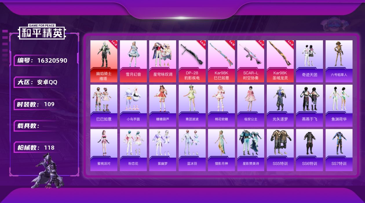 [16320590]安卓 手Q-1神装-3粉装-4特效枪-0载具-2粉色飞行器-40780热力值-5王牌印记-109套装-118枪皮 【红色神装等级】:幽焰骑士-维塔(三级) 【红色角色神装】:幽焰骑士-维塔 【热门品类】:角色-六号稻草人 【粉色套装】:粉装-雪月幻音,粉装-星穹咏叹调 【粉色枪皮等级】:SCAR-L-时空协奏(三级),Kar98K-巳巳如意(五级),Kar98K-圣域龙灵(三级),DP-28-豹影疾电(五级) 【粉色枪皮】:SCAR-L-时空协奏,Kar98K-巳巳如意,Kar98K-圣域龙灵,DP-28-豹影疾电 【粉色飞行器】:沙丘之主天马,圣域金龙飞行器 【粉色降落伞】:四圣焕新降落伞,蓝莓炮弹降落伞,幽焰骑士降落伞,千金淑猫降落伞,动力核心降落伞,鬼刀降落伞,星穹咏叹调降落伞,辉羽雀灵降落伞 【稀有套装】:套装-巳巳如意,套装-小鸟芋圆,套装-糖糖葫芦,套装-青团波波,套装-棉花软糖,角色-临安公主,角色-光矢逐梦,套装-燕燕于飞,套装-鱼渊荷华,角色-蜜桃派对,套装-粉恋花,套装-紫幽梦,套装-蓝冰羽,角色-猎影月神,角色-六号稻草人,套装-星影赞美诗 【稀有枪皮】:AKM-生命誓言,AKM-破晓战魂,AKM-萌趣颜团子,AKM-霓虹街区,M16A4-夜灯,M16A4-生命誓言,SCAR-L-扶摇飞仙,SCAR-L-生命誓言,M416-蓝色火焰,GROZA-春暖花开,AUG-耀粉歌者,AUG-月影灵韵,QBZ-原初圣火,M762-拳皇97,M762-牛气冲天,G36C-星穹咏叹调,AC-VAL-六号稻草人,蜜獾-天降萌叽,UZI-啾咪啾咪,UZI-炫彩节奏,UZI-生命誓言,UMP45-生命誓言,Vector-生命誓言,汤姆逊-耀粉歌者,汤姆逊-樱桃泡泡,MP5K-甜蜜誓约,AKS-74U-辉羽雀灵,P90-巳巳如意,Kar98K-红色方程式,SKS-夜灯,SKS-圣域龙灵,Mini14-原初圣火,Mini14-炫彩节奏,Mini14-生命誓言,Mk47-幻海仙踪,Win94-晶梦幻蝶,M200-翎光蝶翼,M200-六号稻草人,S686-蜜语绒猫,S686-彩虹符号,S686-生命誓言,S686-巳巳如意,S12K-玩趣呆呆,S12K-夜灯,DBS-彩虹符号,M249-拳皇97,DP-28-原初圣火,MG3-幻世战舞者,MG3-智耀战神,P92-拳皇97