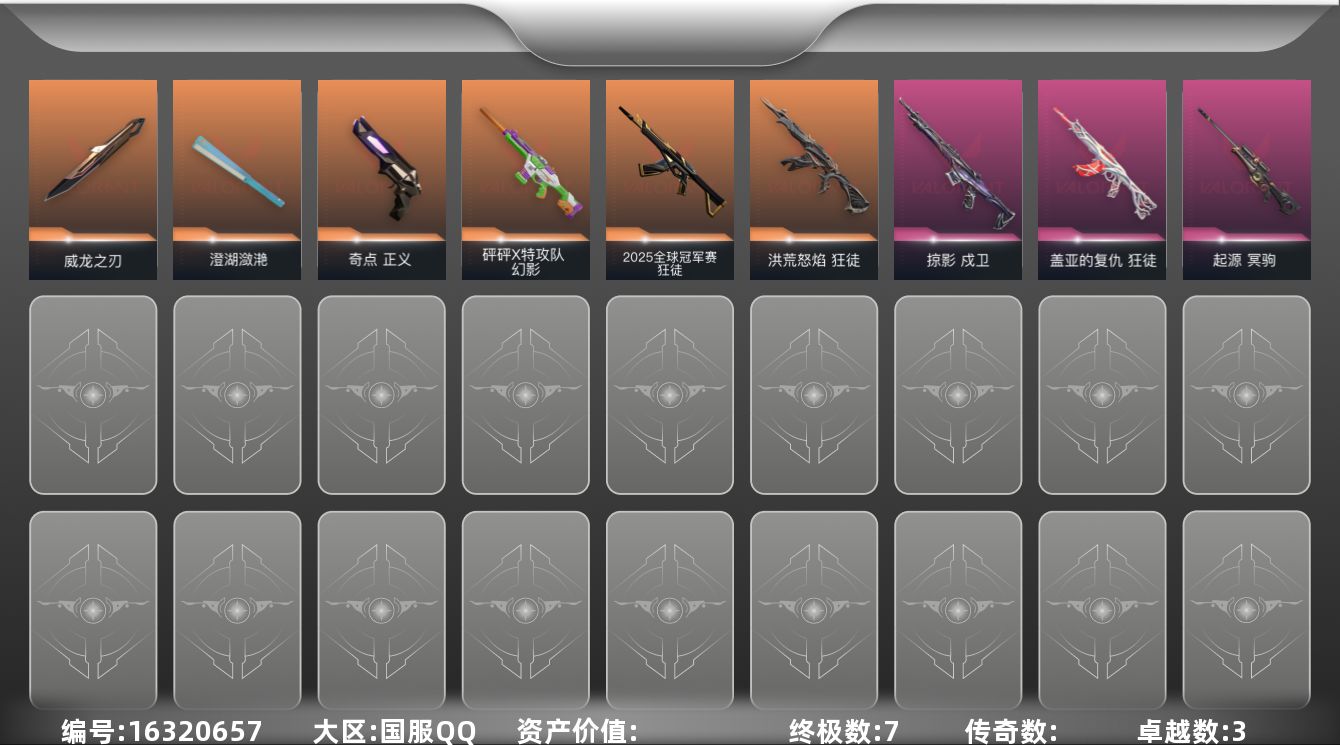 [16320657]【英雄】:幻棱,炼狱,维斯,暮蝶,钛狐,壹决,铁臂,捷风,雷兹,幽影,不死鸟,贤者,猎枭,蝰蛇,零,芮娜,奇乐,尚勃勒,霓虹,斯凯,夜露,星礈,K/O,海神,盖可,黑梦,钢锁 【近战 武器】:近战武器-威龙之刃,近战武器-澄湖潋滟 【狂徒】:狂徒-2025全球冠军赛,狂徒-洪荒怒焰,狂徒-盖亚的复仇,狂徒-弧光异彩 【幻影】:幻影-砰砰X特攻队,幻影-噬源兽防卫工程 【戍卫】:戍卫-掠影,戍卫-彩梦之城 【獠犬】:獠犬-弧光异彩 【冥驹】:冥驹-起源 【飞将】:飞将-信手涂鸦 【奥丁】:奥丁-信手涂鸦 【雄鹿】:雄鹿-彩梦之城 【骇灵】:骇灵-无限竞技,骇灵-信手涂鸦 【蜂刺】:蜂刺-弧光异彩 【标配】:标配-超能偶像,标配-彩梦之城 【正义】:正义-奇点,正义-超限闪存,正义-沙尘幻旅,正义-复古浪潮,正义-纳米打击 【鬼魅】:鬼魅-流星兵团,鬼魅-诡秘蛇影,鬼魅-光导纤维,鬼魅-信手涂鸦,鬼魅-星云暗涌 【狂怒】:狂怒-火线狂怒 【卡面】:终章:激斗汉堡 卡面,进入射程 卡面,《双城之战》拥抱 卡面,精灵大战 卡面,欢迎来到底城 卡面,南瓜盛典 卡面,VCT CN首冠 卡面,修车达人 卡面,热舞环节 卡面,超限闪存 卡面,正义的化身 卡面,终章:生意人麦宝 卡面,铁之华 卡面,时间到 卡面,最高舞台 卡面,声感陷阱设计图 卡面,红鳞松叶 卡面,Clutch 卡面,梦幻奶茶 卡面,终章:打造专属狂徒 卡面,趁热吃 卡面,源能反应 卡面,零点嗅探设计图 卡面,终章:瓦娃脸雪糕 卡面,表象之下 卡面,虹吸式咖啡壶 卡面,沙雕爆能器 卡面,无畏契约GO!第一卷:芮娜 卡面,清除名单 卡面,无畏契约GO!第一卷:零 卡面,终章:同步耍酷 卡面,龍记 卡面,化茧成蝶 卡面,《双城之战》金克丝 卡面,完美调谐 卡面 ,暗枪 卡面,铁臂vs雷兹 卡面,钢锁vs盖可 卡面,别冒尖 卡面,夯实根基 卡面,热烈欢迎 卡面,铁臂设计图 卡面,代号红色 卡面,冰淇淋店 卡面,新兵报到 卡面,友军火力 卡面,V契约 卡面,无畏契约 卡面 【喷漆】:嗨宝南瓜灯 喷漆,嘭! 喷漆,都算到了 喷漆,控场勿近 喷漆,小丑猫 喷漆,熊抱 喷漆,蛋糕还是爆能器? 喷漆,超级粉丝 喷漆,捷风差距 喷漆,惊声尖叫 喷漆,2021冠军巡回赛花火 喷漆,拼一枪 喷漆,我觉得不行 喷漆,我的刀呢? 喷漆,纤云