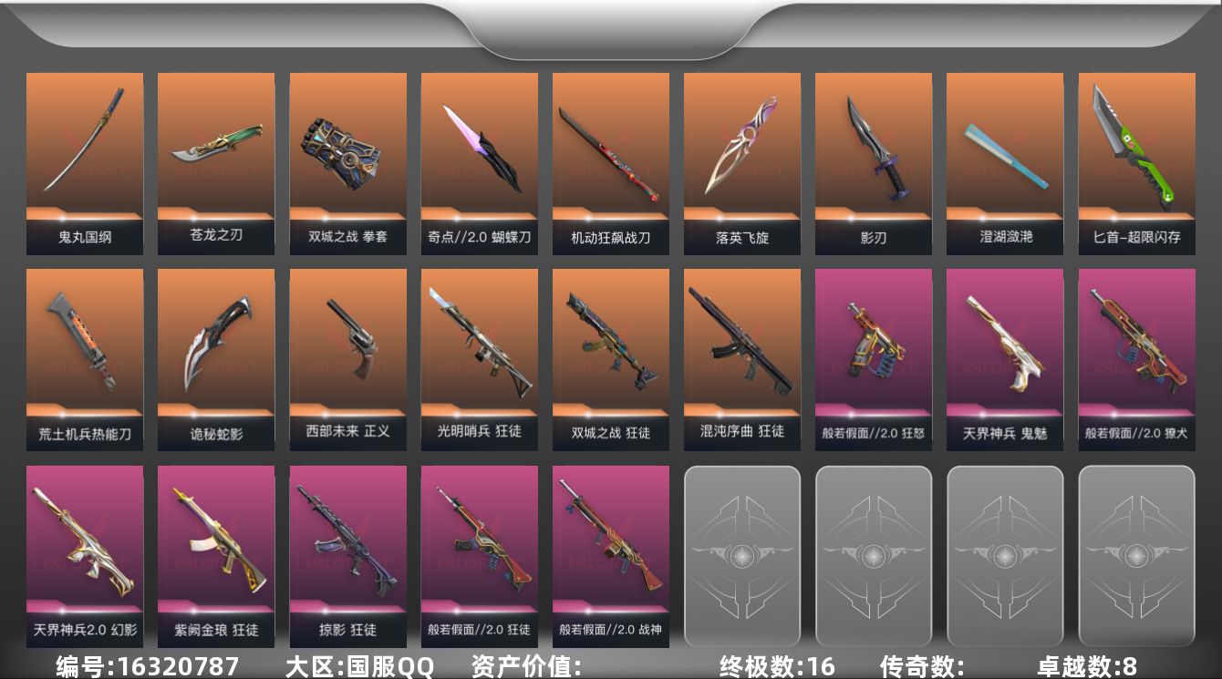 [16320787]【套装】:《双城之战》收藏套装,般若假面//2.0套装 【英雄】:幻棱,炼狱,维斯,暮蝶,钛狐,壹决,铁臂,捷风,雷兹,幽影,不死鸟,贤者,猎枭,蝰蛇,零,芮娜,奇乐,尚勃勒,霓虹,斯凯,夜露,星礈,K/O,盖可,黑梦,钢锁 【近战 武器】:近战武器-5周年//公测重制版 苍龙之刃,近战武器-奇点//2.0 蝴蝶刀,近战武器-落英飞旋,近战武器-澄湖潋滟,近战武器-鬼丸国纲,近战武器-双城之战 拳套,近战武器-超限闪存 匕首,近战武器-荒土机兵 热能刀,近战武器-机动狂飙 战刀,近战武器-影刃,近战武器-诡秘蛇影 军刀 【狂徒】:狂徒-光明哨兵,狂徒-混沌序曲,狂徒-双城之战,狂徒-般若假面//2.0,狂徒-掠影,狂徒-紫阙金琅,狂徒-荒土机兵,狂徒-诡秘蛇影 【幻影】:幻影-天界神兵//2.0,幻影-超限闪存,幻影-纳米打击,幻影-末日之翼 【戍卫】:戍卫-浮光跃金,戍卫-逆冲蛮牛,戍卫-折光棱晶 【獠犬】:獠犬-般若假面//2.0,獠犬-模拟赫兹,獠犬-逆冲蛮牛 【冥驹】:冥驹-荒土机兵,冥驹-模拟赫兹 【飞将】:飞将-末日之翼 【莽侠】:莽侠-超限闪存,莽侠-诡秘蛇影 【战神】:战神-般若假面//2.0,战神-浮光跃金 【奥丁】:奥丁-纳米打击,奥丁-末日之翼 【判官】:判官-诡秘蛇影,判官-纳米打击x 【雄鹿】:雄鹿-模拟赫兹,雄鹿-逆冲蛮牛 【骇灵】:骇灵-荒土机兵,骇灵-浮光跃金 【蜂刺】:蜂刺-超限闪存,蜂刺-折光棱晶 【标配】:标配-荒土机兵,标配-浮光跃金,标配-折光棱晶 【正义】:正义-西部未来,正义-超限闪存,正义-纳米打击 【鬼魅】:鬼魅-天界神兵,鬼魅-诡秘蛇影,鬼魅-模拟赫兹 【狂怒】:狂怒-般若假面//2.0,狂怒-逆冲蛮牛 【短炮】:短炮-末日之翼 【卡面】:终章:激斗汉堡 卡面,进入射程 卡面,分崩离析 卡面,纳米打击 卡面,抑制技术 卡面,激斗汉堡 卡面,瓦娃脸雪糕 P2 卡面,从黄昏到黎明 卡面,荒土机兵 卡面,银弹猎手 卡面,逆冲蛮牛 卡面,《双城之战》拥抱 卡面,精灵大战 卡面,欢迎来到底城 卡面,南瓜盛典 卡面,VCT CN首冠 卡面,唱片的故事 卡面,钢弓与箭弦 卡面,排除故障 卡面,战术桌游 卡面,悠享食光 卡面,修车达人 卡面,热舞环节 卡面,模拟赫兹 卡面,浮光跃金 卡面,超限闪存 卡面,维斯工牌 卡面,正义的化