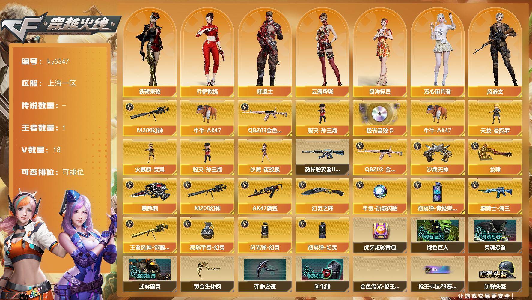 [16323202]上海一区-20V-1王者武器数-0炫金武器数 【热门武器】:QBZ03-金色蔷薇,M200-幻神,牛牛-AK47,毁灭-孙三炮 【音效卡】:Barrett-极光音效卡 【角色】:奇洋探员,乔伊教练,修道士,云海玲珑,芳心审判者,风暴女,娟娟,龙儿,麻雀,曼陀罗-X,铁骑荣耀 【人偶武器】:毁灭-孙三炮,天龙-曼陀罗,火麒麟-灵狐,牛牛-AK47,沙鹰-夜玫瑰 【挑战大师】:激光毁灭者III-白马银枪 【英雄级武器】:AK47-黑鲨,QBZ03-金色蔷薇,黑骑士-海王,M200-幻神,王者风神-觉醒版,沙鹰-天神,龙啸,麒麟刺,幻灵之锋,高爆手雷-幻灵,手雷-动感闪耀,闪光弹-幻灵*2,烟雾弹-幻灵,烟雾弹-竞技荣光 【道具】:虎牙炫彩背包,黄金生化钩,绿色巨人,灵魂忍者,迷雾幽灵,夺命之镰,防化服*2,金色流光-枪王排位*2,枪王排位29赛季金色流光,防弹头盔*2,防弹衣*2,C4工具钳*2,手雷包*2 【特殊枪械】:
