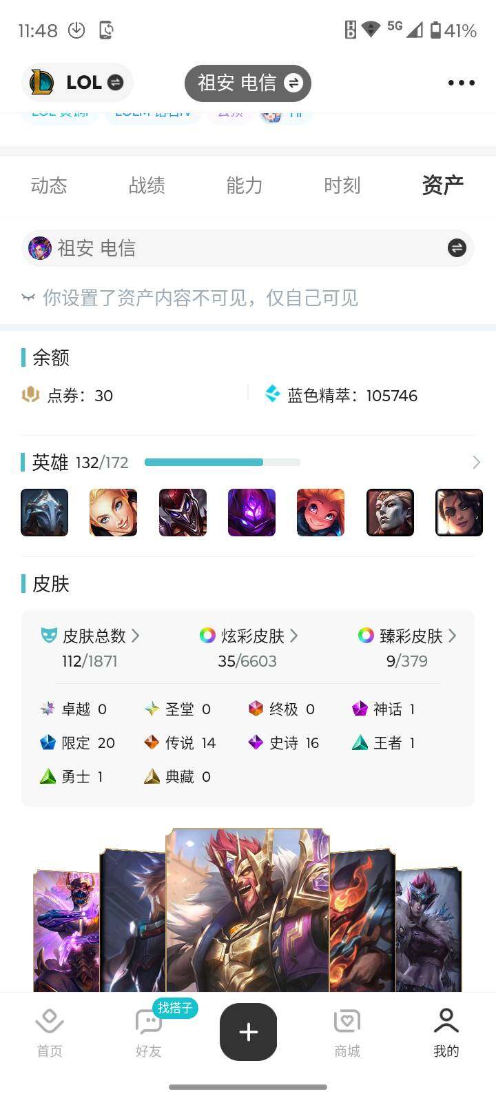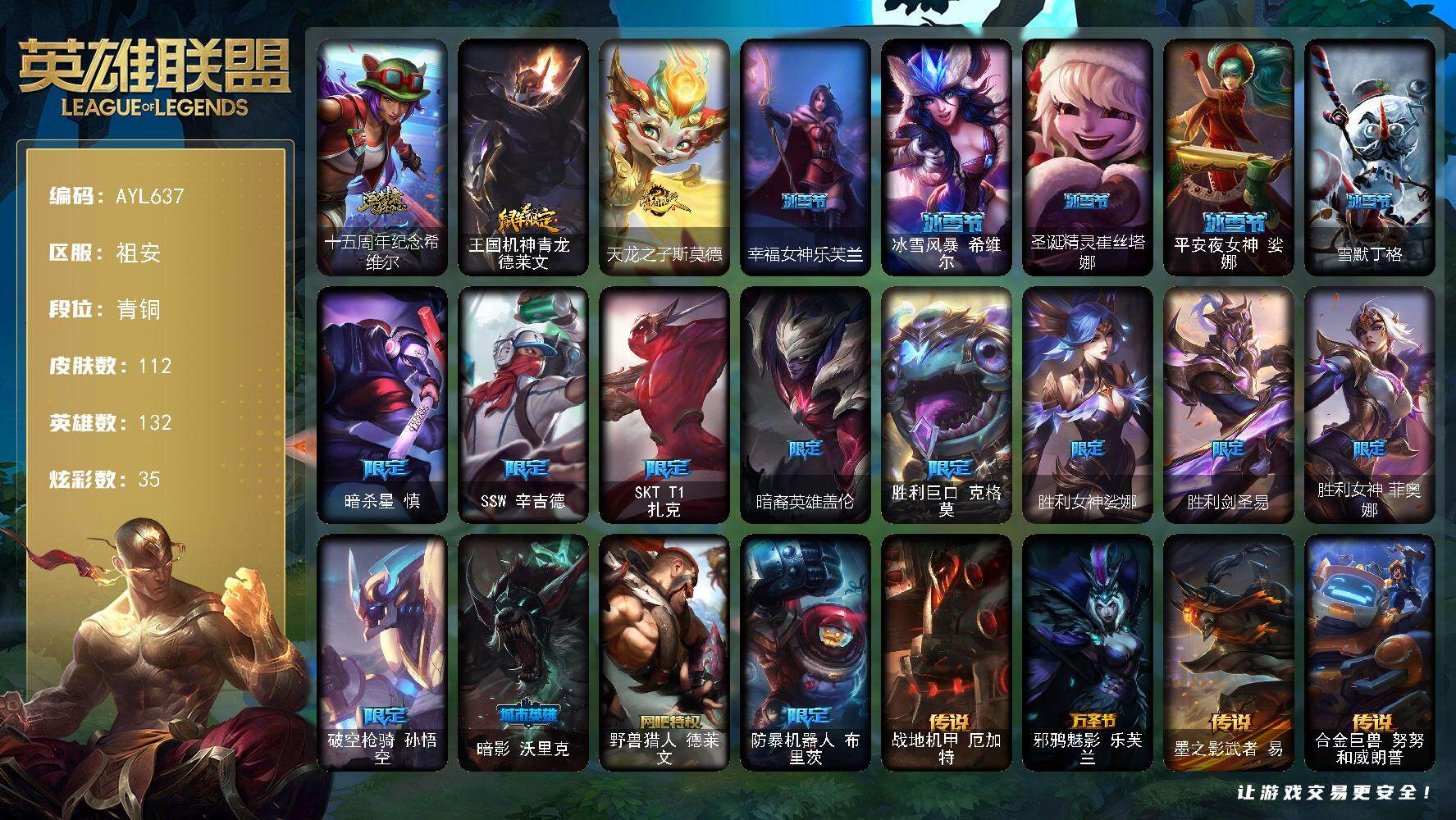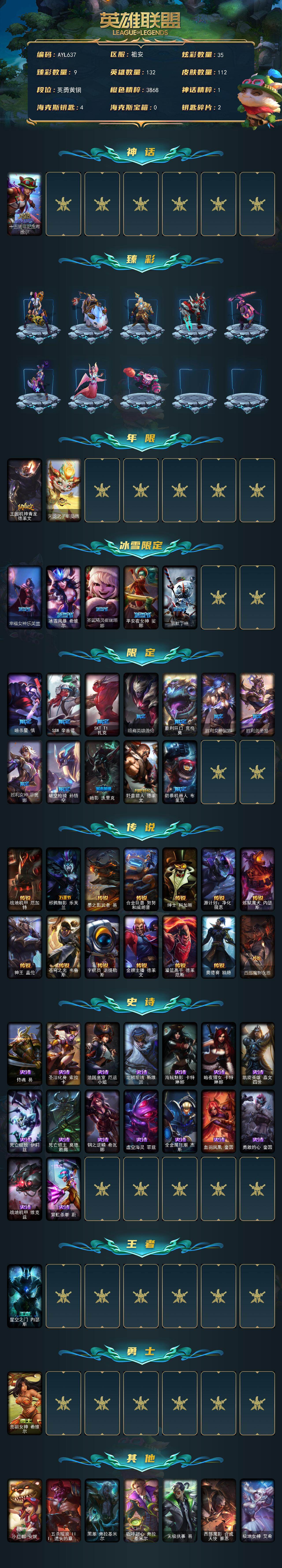 [16323373]【店主推荐捡漏号】青铜段位-132英雄-112皮肤-35炫彩-0终极-1神话-20限定-14传说-16史诗