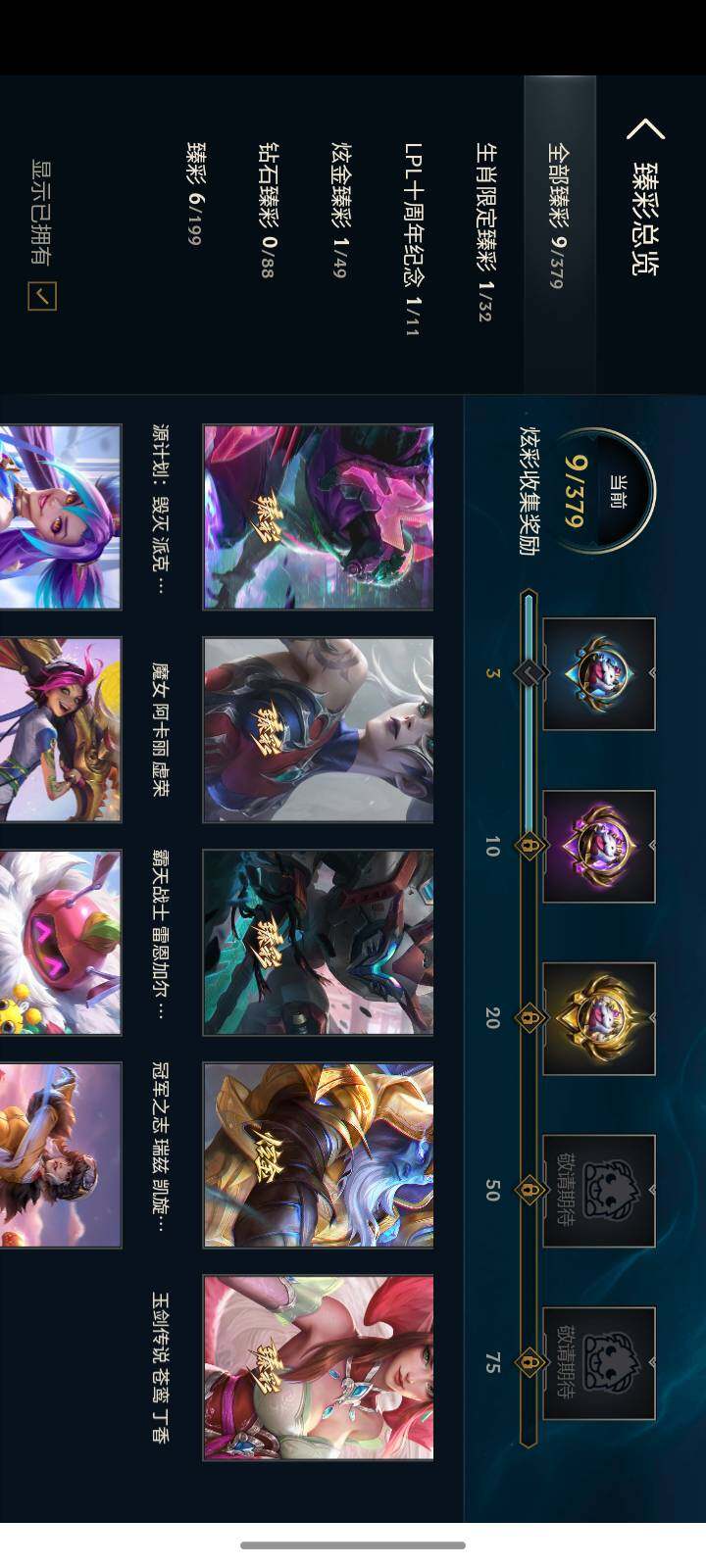 【臻彩皮肤】:神龙烈焰金克丝珍珠龙息,无畏骑士瑟庄妮赤子初心,冠军之志瑞兹凯旋圣装,霸天战士雷恩加尔星啸天火,源计划毁灭派克幻灭,星之守护者金克丝黑洞,玉剑传说苍鸾丁香,可爱可爱粉红红布里茨,魔女阿卡丽虚荣
