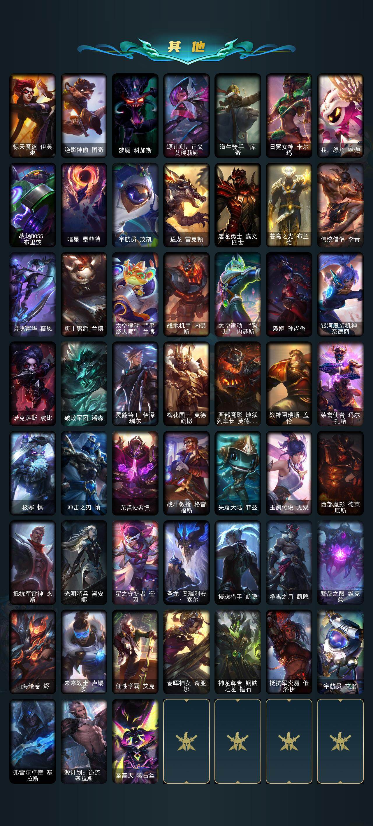 【其他皮肤1】:小红帽安妮,五杀摇滚III遗失的章节奥拉夫,黑潮弗拉基米尔,咖啡甜心弗拉基米尔,无极执事易,西部魔影合成天使赛恩,极地女神艾希,惊天魔盗伊芙琳,绝影神偷图奇,梦魇科加斯,源计划正义艾瑞莉娅,海牛骑手库奇,日冕女神卡尔玛,我怒角维迦,战场BOSS布里茨,暗星墨菲特,宇航员茂凯,猛龙雷克顿,屠龙勇士嘉文四世,苍穹之光布兰德,传统僧侣李青,灵魂莲华薇恩,废土男爵兰博,太空律动串烧大师兰博,战地机甲内瑟斯,太空律动狗头内瑟斯,枭姬孙尚香,银河魔装机神奈德丽,诺克萨斯波比,破败军团潘森,灵能特工伊泽瑞尔,梅花国王莫德凯撒,西部魔影地狱列车长莫德凯撒,战神阿瑞斯盖伦,荣誉使者玛尔扎哈,极寒慎,冲击之刃慎,荣誉使者慎,战斗教授格雷福斯,失落大陆菲兹,玉剑传说无双,西部魔影德莱厄斯,抵抗军雷神杰斯,光明哨兵黛安娜,星之守护者奎因,圣龙奥瑞利安索尔,摄魂猎手凯隐
