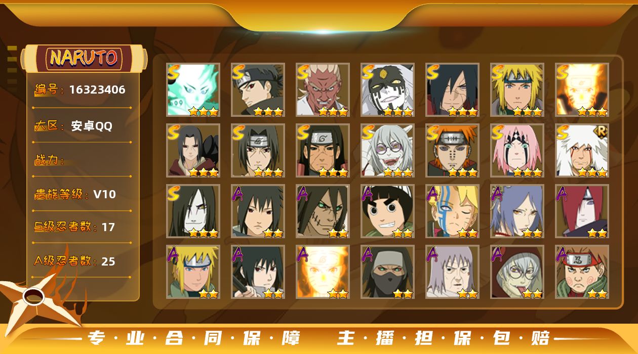 【S级忍者】:千手柱间「秽土转生」(3星),宇智波鼬「秽土转生」(3星),宇智波斑「秽土转生·解」(3星),春野樱「忍界大战」(3星),艾「忍界大战」(3星),宇智波鼬「须佐能乎」(3星),宇智波止水「须佐能乎」(3星),自来也「舞之豪杰」(3星),大蛇丸(3星),波风水门(3星),药师兜「仙人模式」(3星),漩涡鸣人「九喇嘛连结」(3星),佩恩「天道」(3星),大筒木桃式(3星),大筒木舍人「最终章」(3星),漩涡鸣人「暴怒·第六尾」(3星),波风水门「九喇嘛连结」(3星)