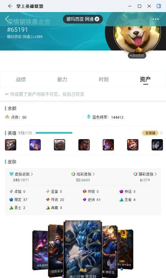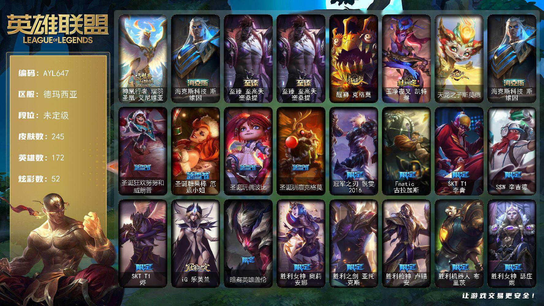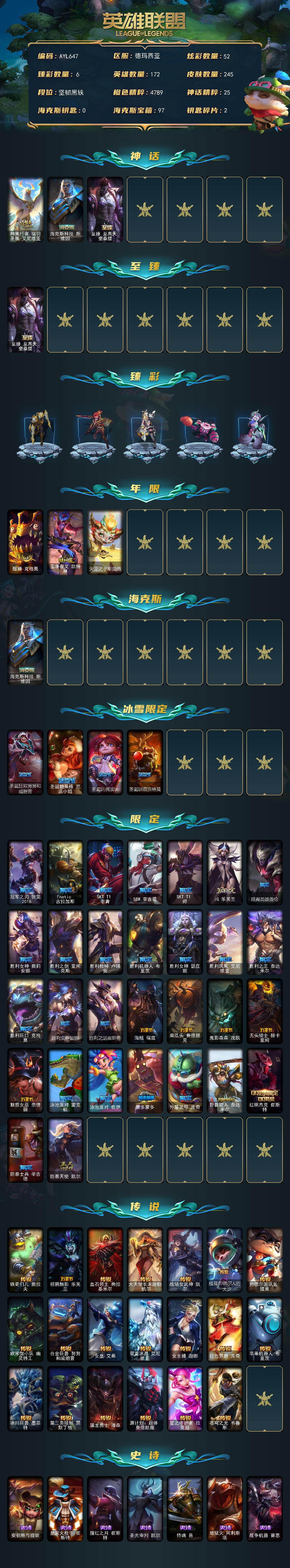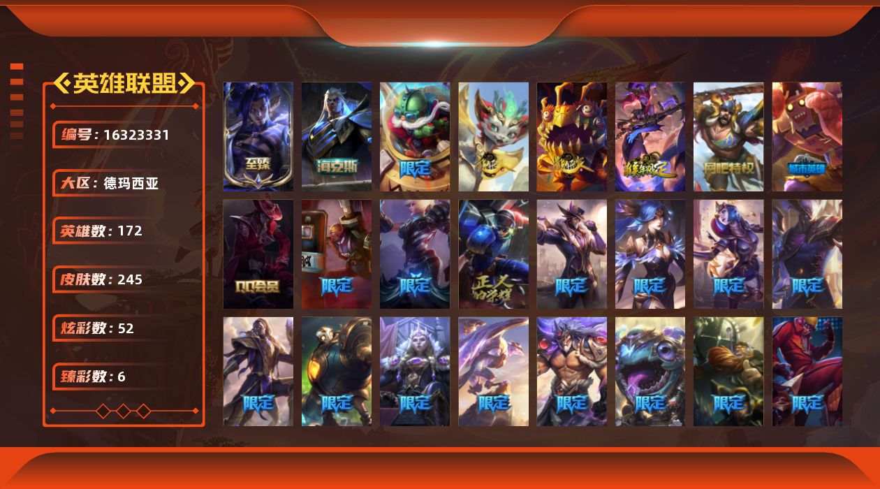 未定级段位-172英雄-245皮肤-52炫彩-0终极-3神话-37限定-20传说-61史诗