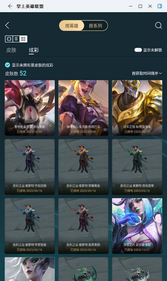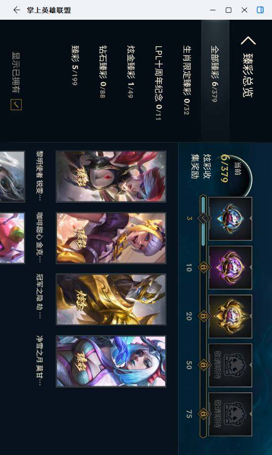 【臻彩皮肤】:冠军之隐劫凯旋圣装,黎明使者锐雯黑夜使者,咖啡甜心金克丝核桃巴菲,可爱可爱粉红红布里茨,魔女阿卡丽虚荣,净雪之月莫甘娜冬虹