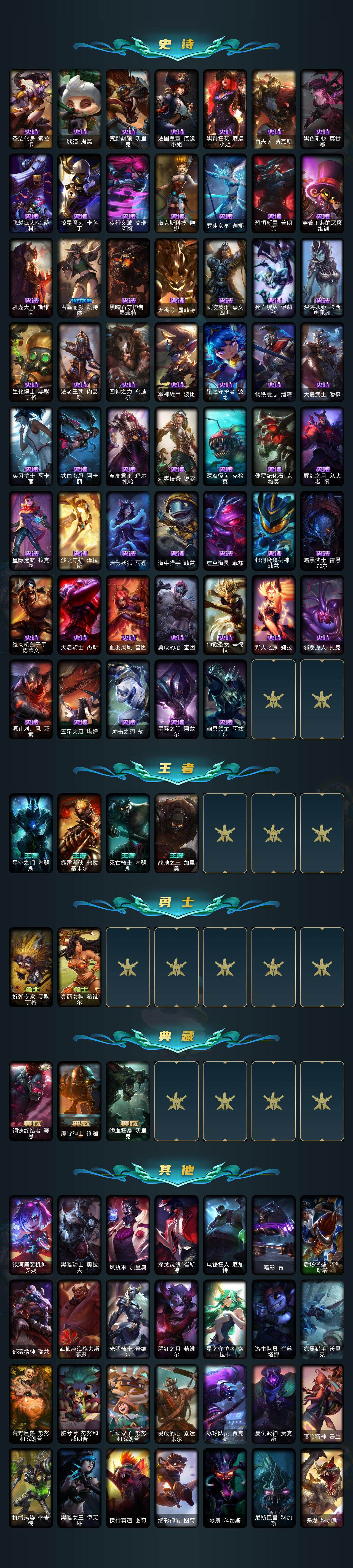 【史诗皮肤】:安伯斯与提妮,皇家火枪手崔斯特,腥红之月崔斯特,圣光审判凯尔,侍魂易,地狱火阿利斯塔,战争机器赛恩,圣洁化身索拉卡,熊猫提莫,荒野豺狼沃里克,法国皇室厄运小姐,黑帮狂花厄运小姐,百夫长贾克斯,黑色荆棘莫甘娜,飞越疯人院萨科,掠星魔刃卡萨丁,夜行义贼艾瑞莉娅,海克斯科技迦娜,寒冰女皇迦娜,恐惧新星普朗克,穿着正装的恶魔维迦,驯龙大师斯维因,古墓丽影凯特琳,黑曜石守护者墨菲特,无畏号墨菲特,凯旋英雄嘉文四世,死亡绽放伊莉丝,深海妖姬卡西奥佩娅,生化博士黑默丁格,法老王朝内瑟斯,四神之力乌迪尔,军神战甲波比,星之守护者波比,钢铁意志潘森,大夏武士潘森,实习护士阿卡丽,铁血女忍阿卡丽,至高君王玛尔