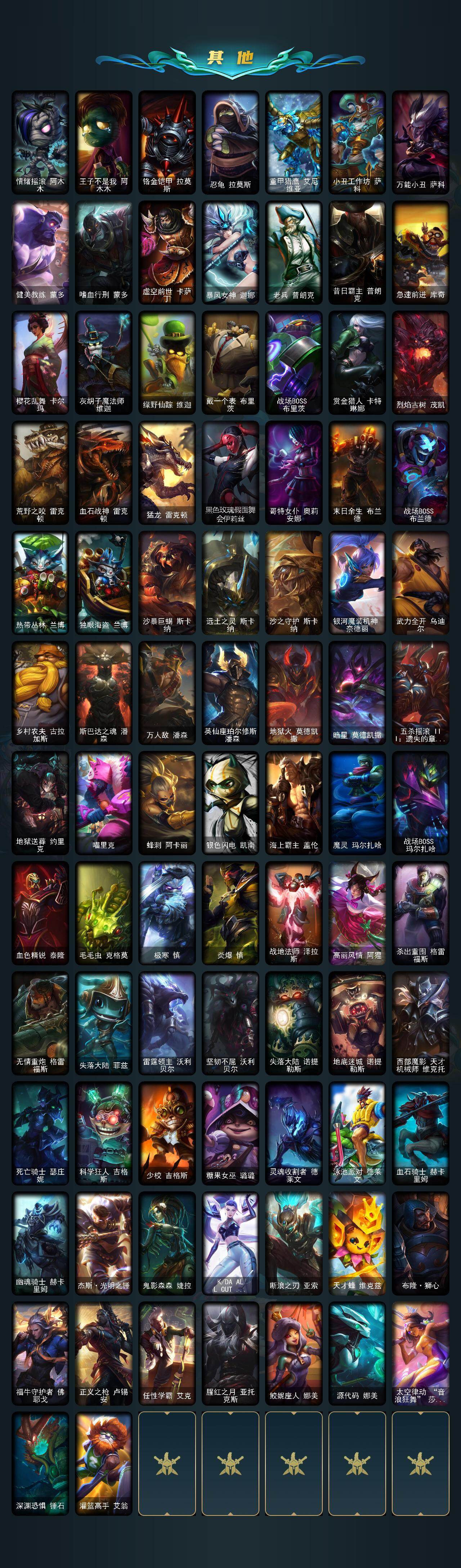 【传说皮肤】:铁哥们儿奥拉夫,邪鸦魅影乐芙兰,血石领主弗拉基米尔,大天使长米迦勒凯尔,战场女武神凯尔,提莫约德尔人的一大步,约德尔国队长提莫,欧米伽小队幽灵特工,合金巨兽努努和威朗普,女皇艾希,双重冰晶艾尼维亚,女主播迦娜,红色男爵库奇,苹果机器人布里茨,冰川巨兽墨菲特,第三类接触黑默丁格,屠龙勇士潘森,源计划超体莫德凯撒,星之守护者拉克丝,苍穹之光韦鲁斯