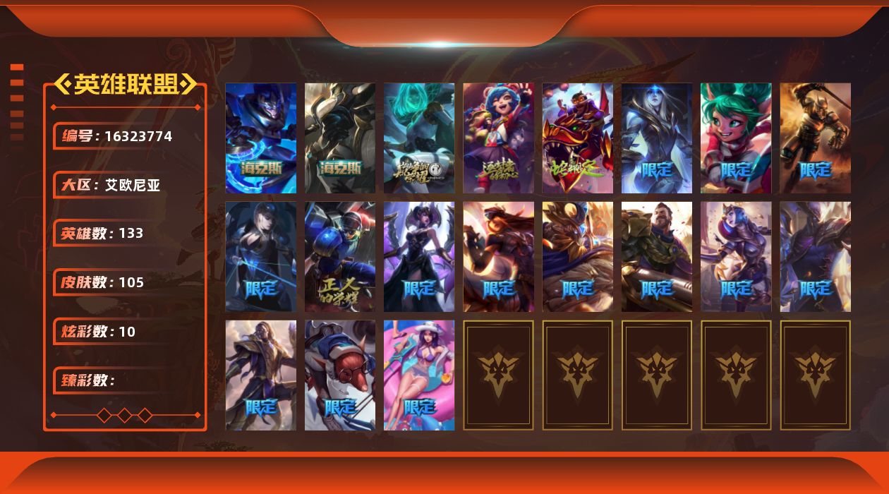 [16323774]【店主推荐捡漏号】未定级段位-133英雄-105皮肤-10炫彩-0终极-4神话-19限定-11传说-27史诗
