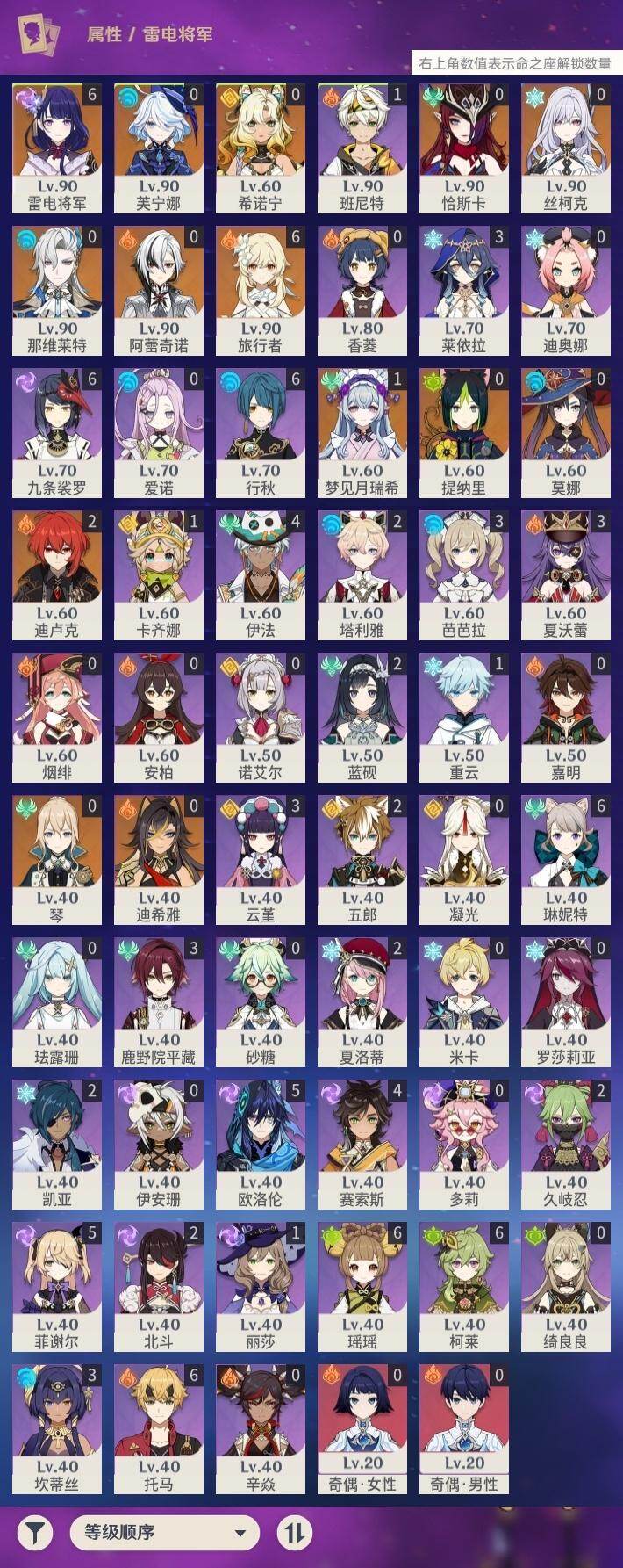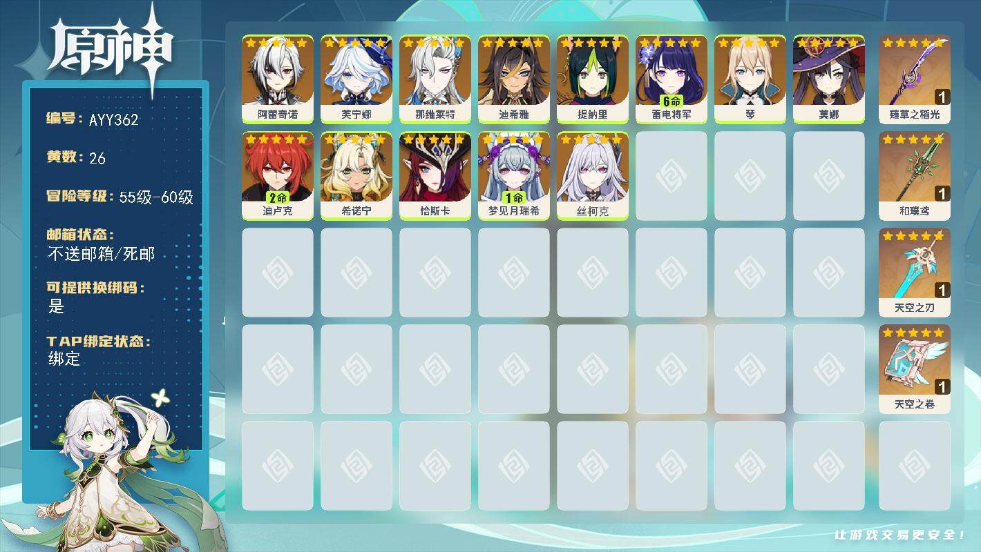 [16323847]57级/26黄/女主/13个五星角色/4个五星武器 0命阿蕾奇诺,0命芙宁娜,0命那维莱特,0命迪希雅,0命提纳里,满命雷电将军,0命琴,0命莫娜,2命迪卢克,0命希诺宁,0命恰斯卡,1命梦见月瑞希,0命丝柯克,精1薙草之稻光,精1和璞鸢,精1天空之刃,精1天空之卷