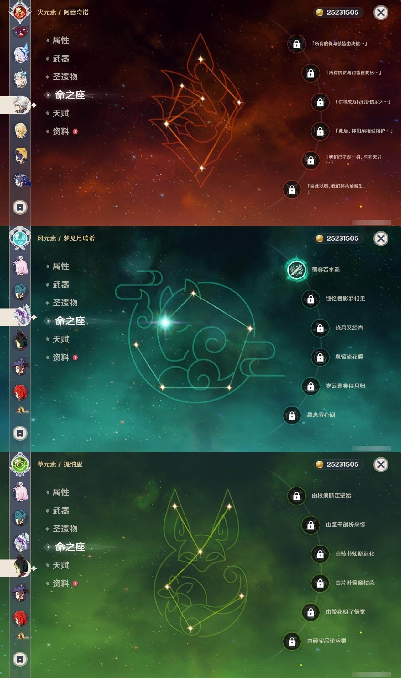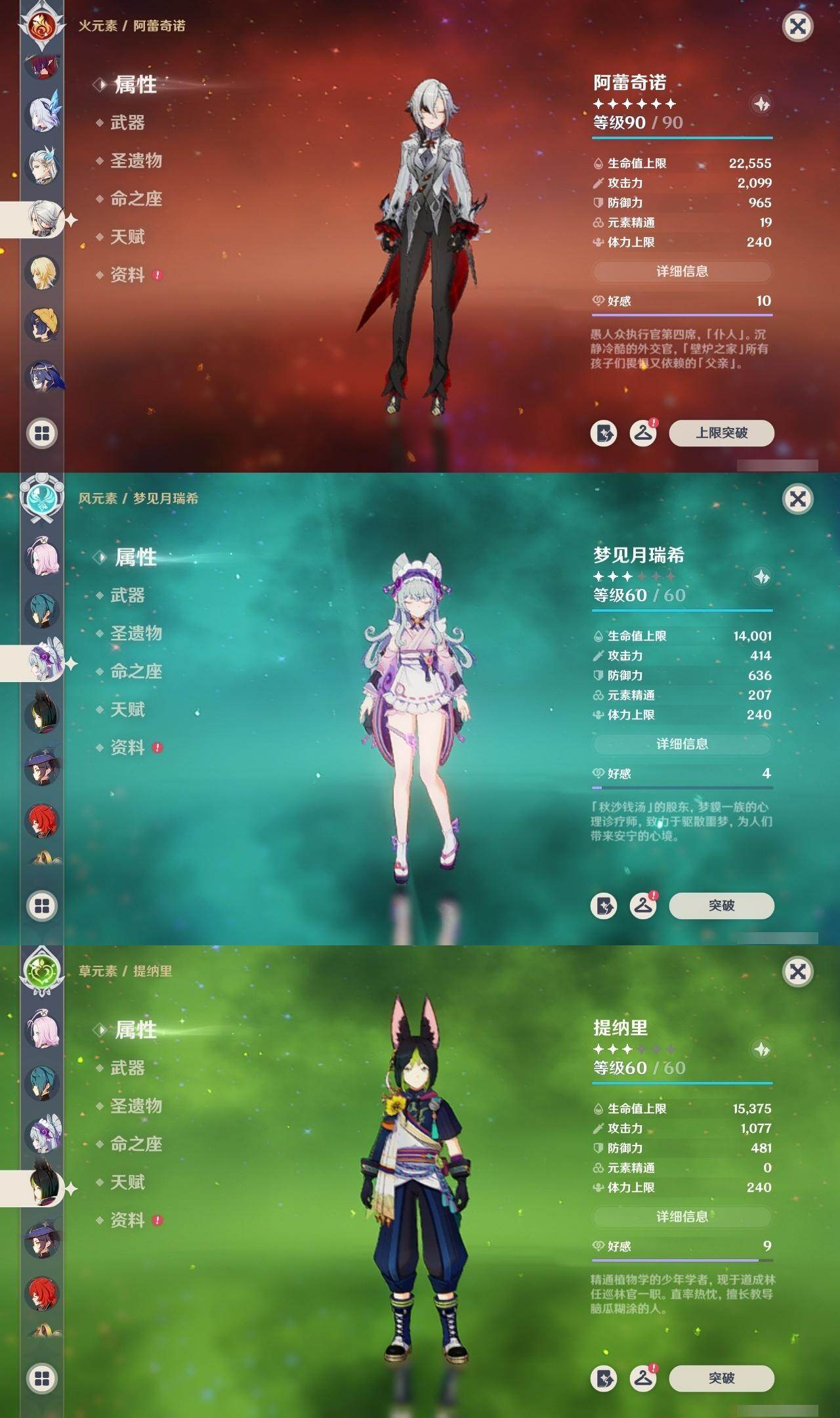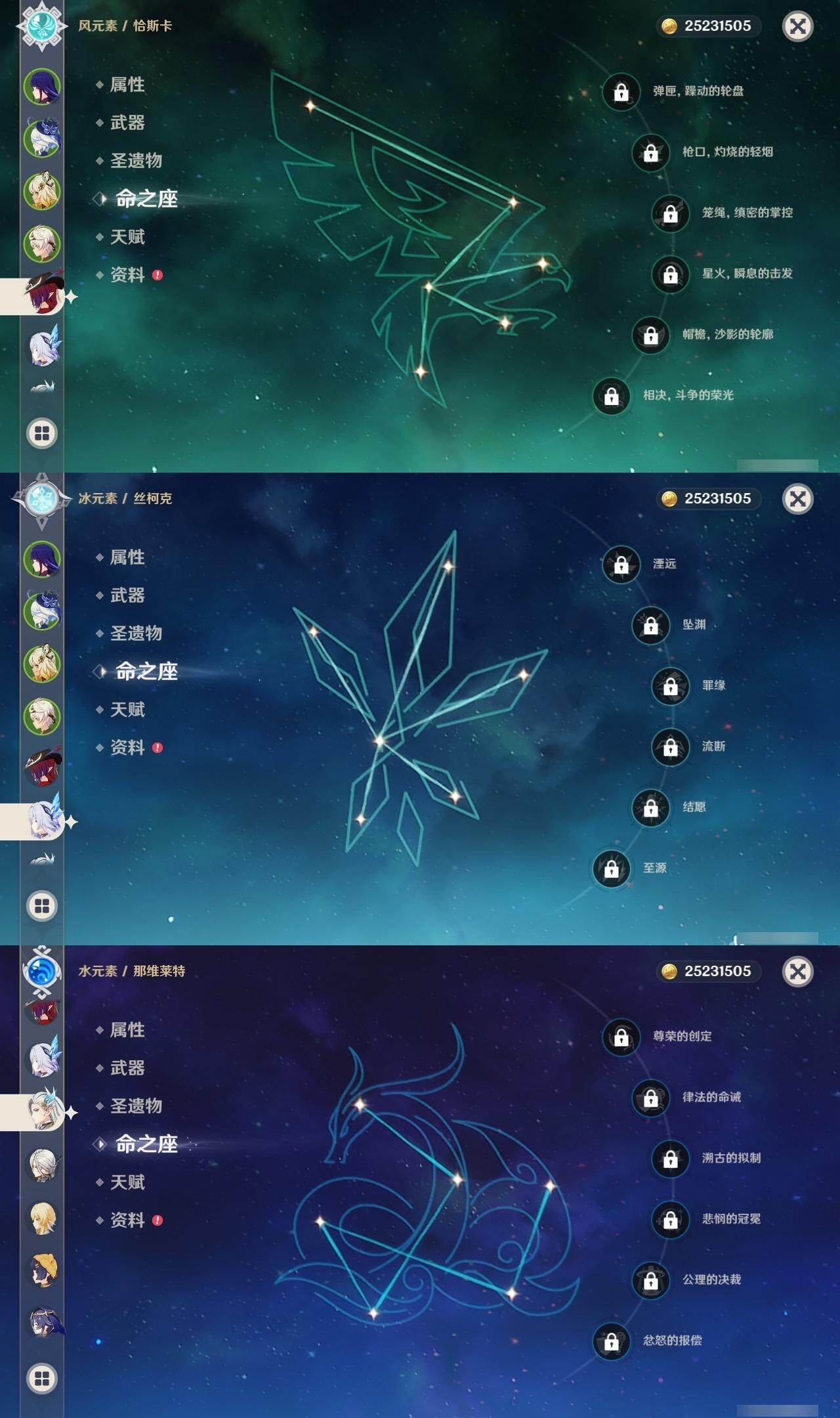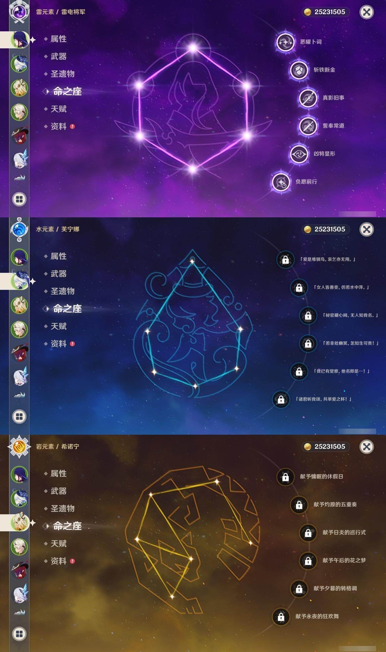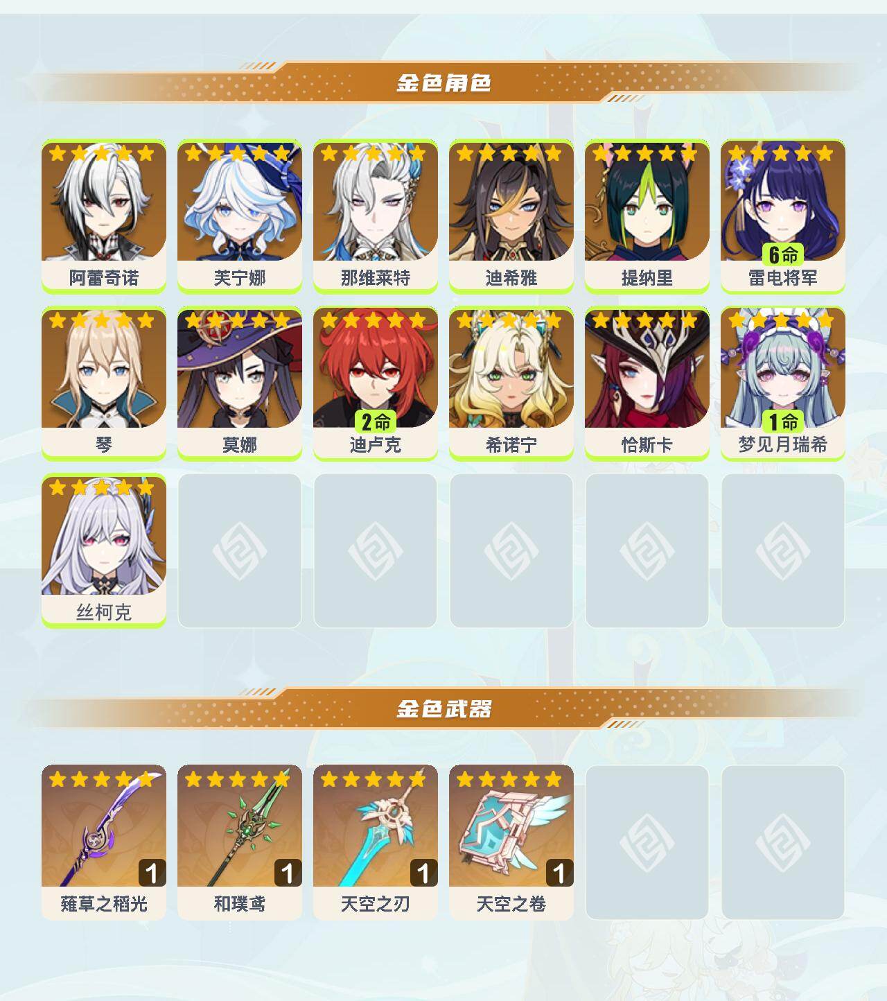 0命阿蕾奇诺,0命芙宁娜,0命那维莱特,0命迪希雅,0命提纳里,满命雷电将军,0命琴,0命莫娜,2命迪卢克,0命希诺宁,0命恰斯卡,1命梦见月瑞希,0命丝柯克,精1薙草之稻光,精1和璞鸢,精1天空之刃,精1天空之卷