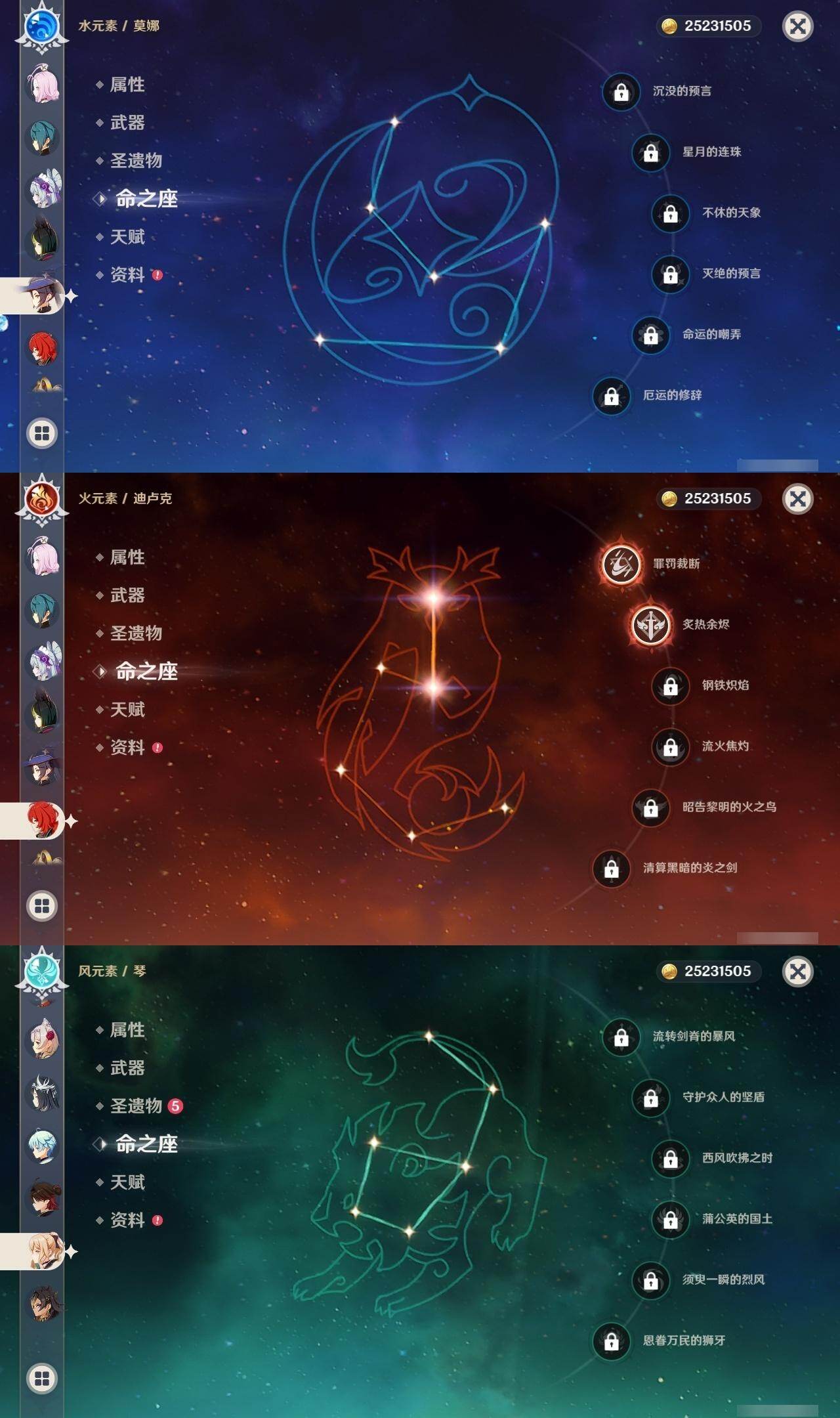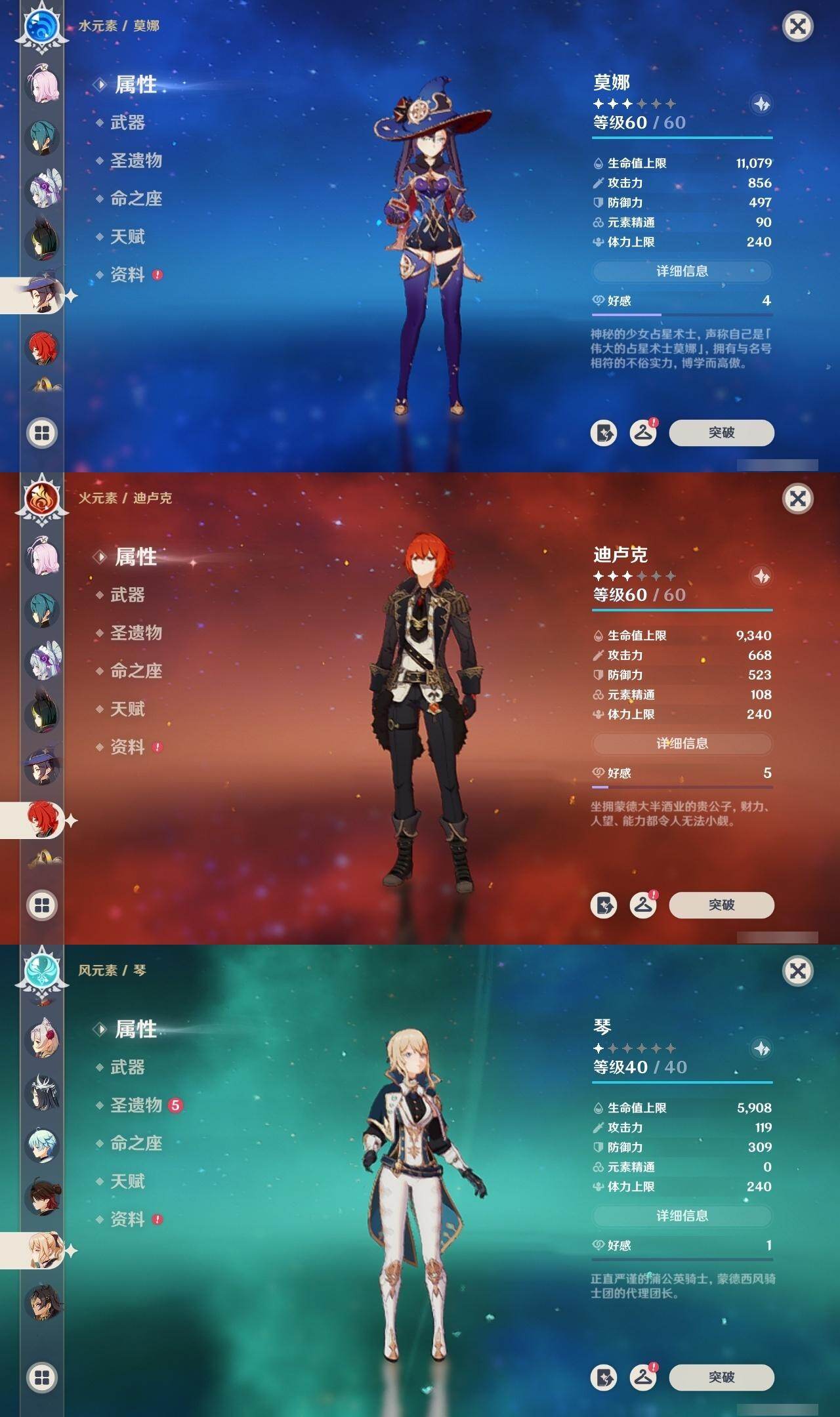 雷电将军,莫娜,迪卢克,琴