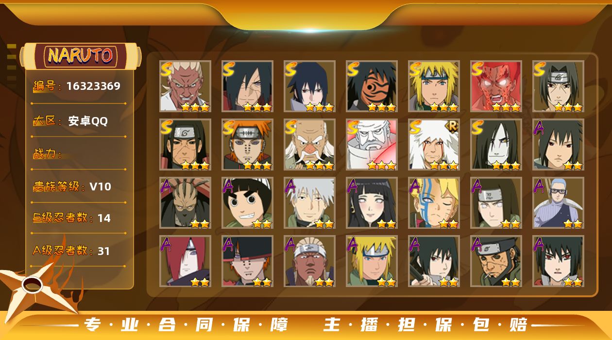 【S级忍者】:千手柱间「秽土转生」(3星),宇智波斑「秽土转生·解」(3星),大野木「忍界大战」(3星),艾「忍界大战」(3星),宇智波鼬「须佐能乎」(3星),自来也「舞之豪杰」(3星),大蛇丸(3星),自来也「传说中的三忍」(3星),波风水门(3星),神秘面具男「红夜之刃」(3星),迈特凯「死门」(3星),佩恩「天道」(3星),宇智波佐助「永恒万花筒」(3星),大筒木金式(3星)