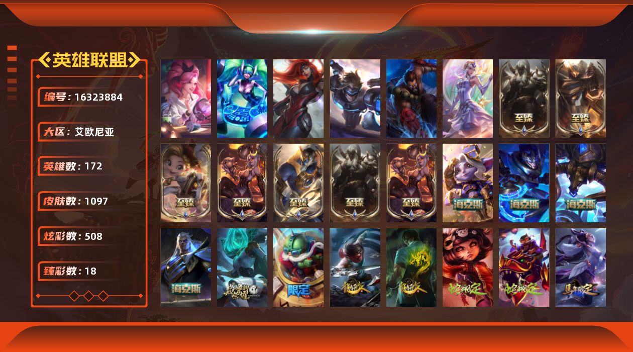 [16323884]【店主推荐捡漏号】铂金段位-172英雄-1097皮肤-508炫彩-8终极-13神话-229限定-98传说-215史诗
