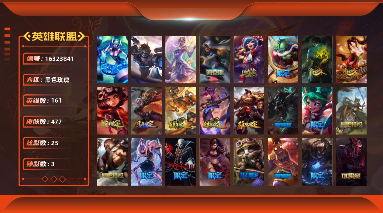 [16323841]可二次【特价出售/店主推荐】开十把匹配后可以开始排位.未定级段位-161英雄-477皮肤-25炫彩-3终极-2神话-90限定-37传说-124史诗